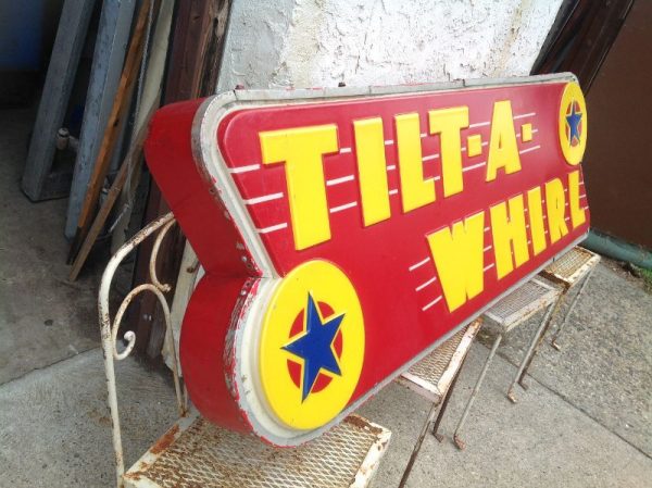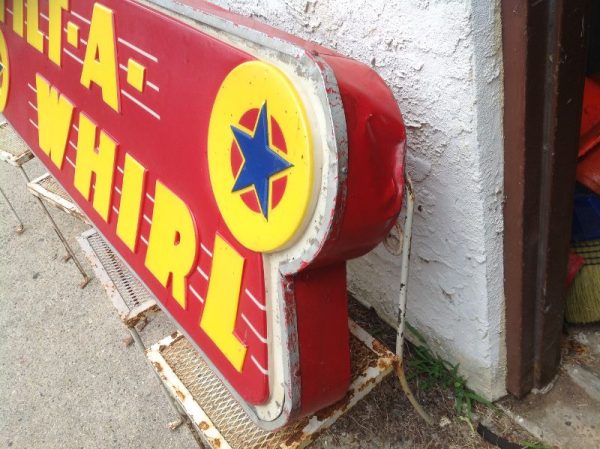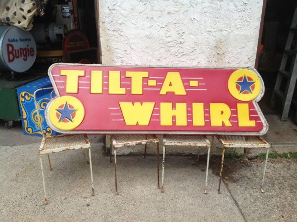 Tilt-A-Whirl mid century amusement p-ark ride signs in as found condition. Unit appear to be complete with all electrical insides but has not been tested to see if it illuminate. Light box measures 75″ long x 24″ high x 6″ wide with some dings and dents. Old style Tilt signs are getting harder to find, so now’s your chance………..