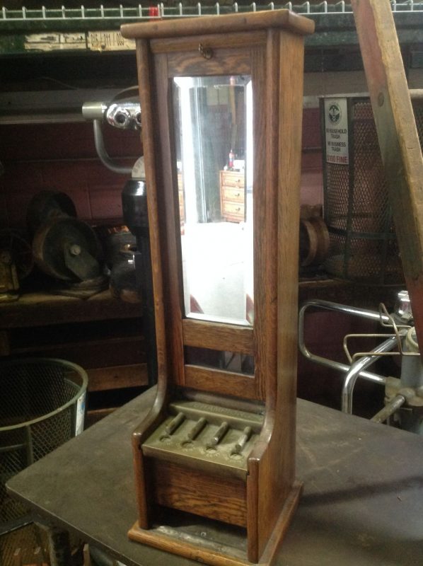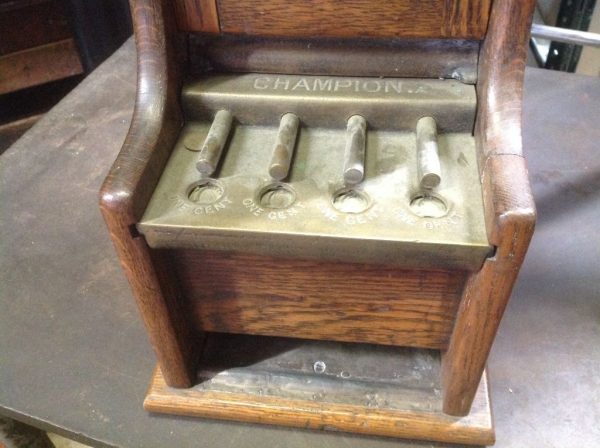Antique Gotham 1cent coin operated Champion vending machine in as found condition. Nice patina. Coin mechanism sticks but working. A good cleaning and she’s ready to go…….