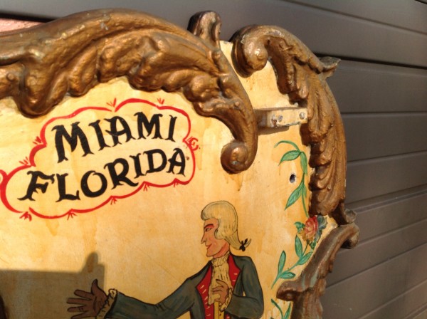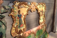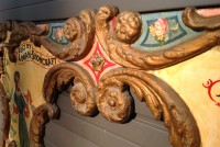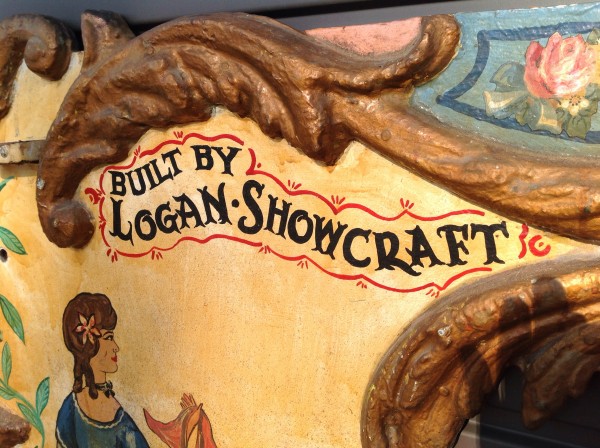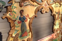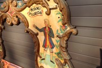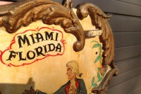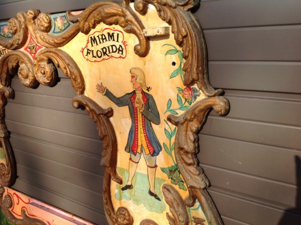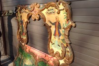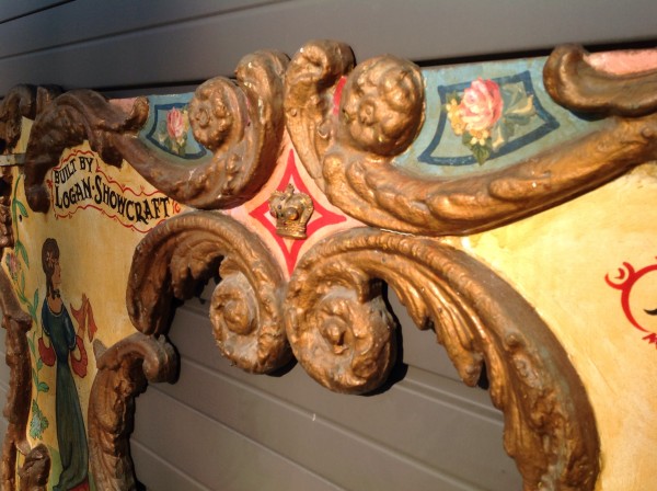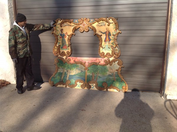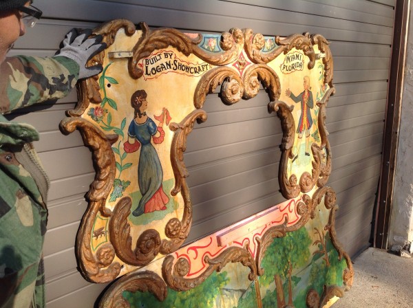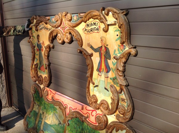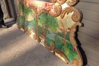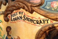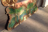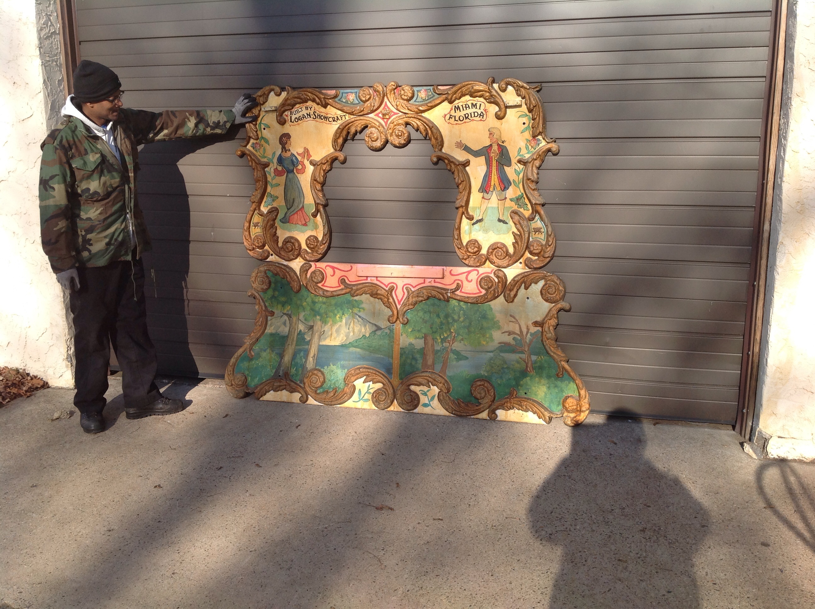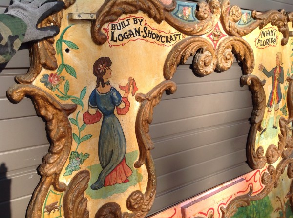 Vintage band organ facade off a Logan handcrafted band organ manufactured in Miami Florida. The organ was destroyed but the front facade remained intact. Decorative with bright park paint colors and hand painted graphics. As found condition but worthy of displaying just the way you see it………