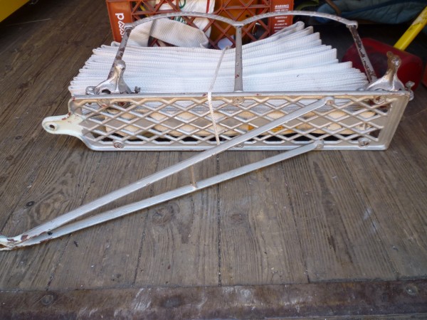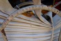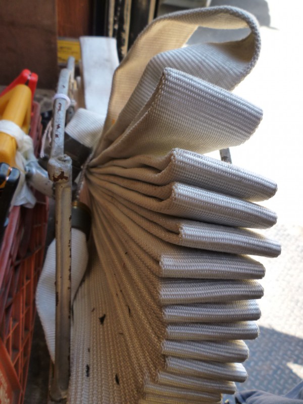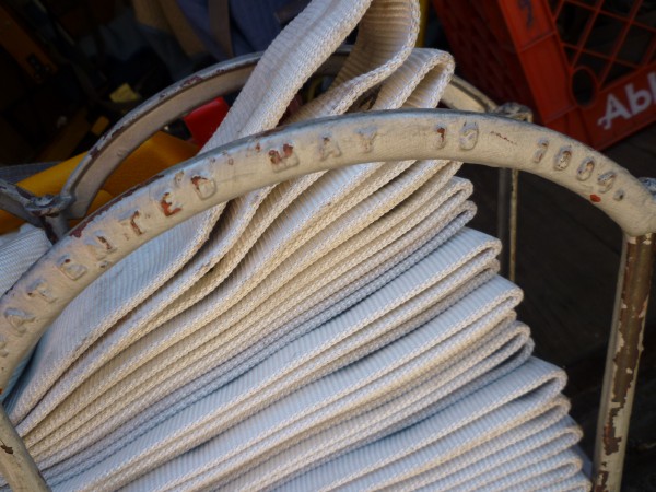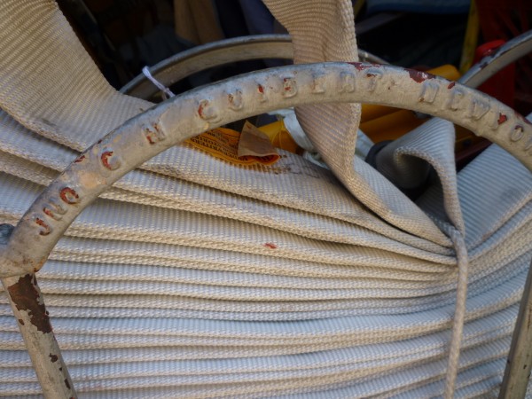 Cast metal fire hose hanger complete with mounting brackets. Dated 1884 and marked NY, NY. Fire hoses of this type were located on each floor of old buildings. This particular hanger once hung in an old Philadelphia building on North Broad Street. Nice addition to any fire collection. Many are available, so ask for availability……..