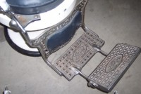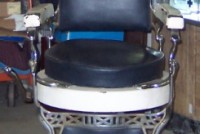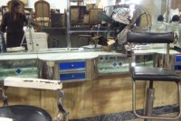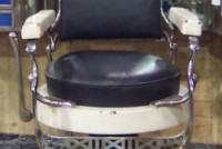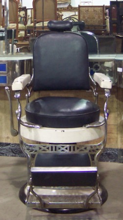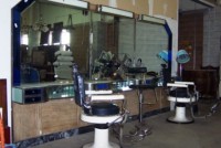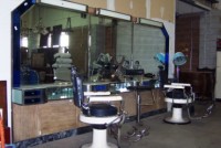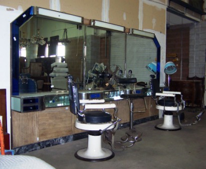 A fantastic Art Deco Barber Shop Back Bar with chairs and mirrors. Looking for something nice to add to your game room or just starting out to open a barber shop, then this back bar is the one. Blue art deco mirror glass adorns the outer edges of the silver mirror. Some minor repairs will be needed to two pieces of blue mirror. If interested, please call for additional details………