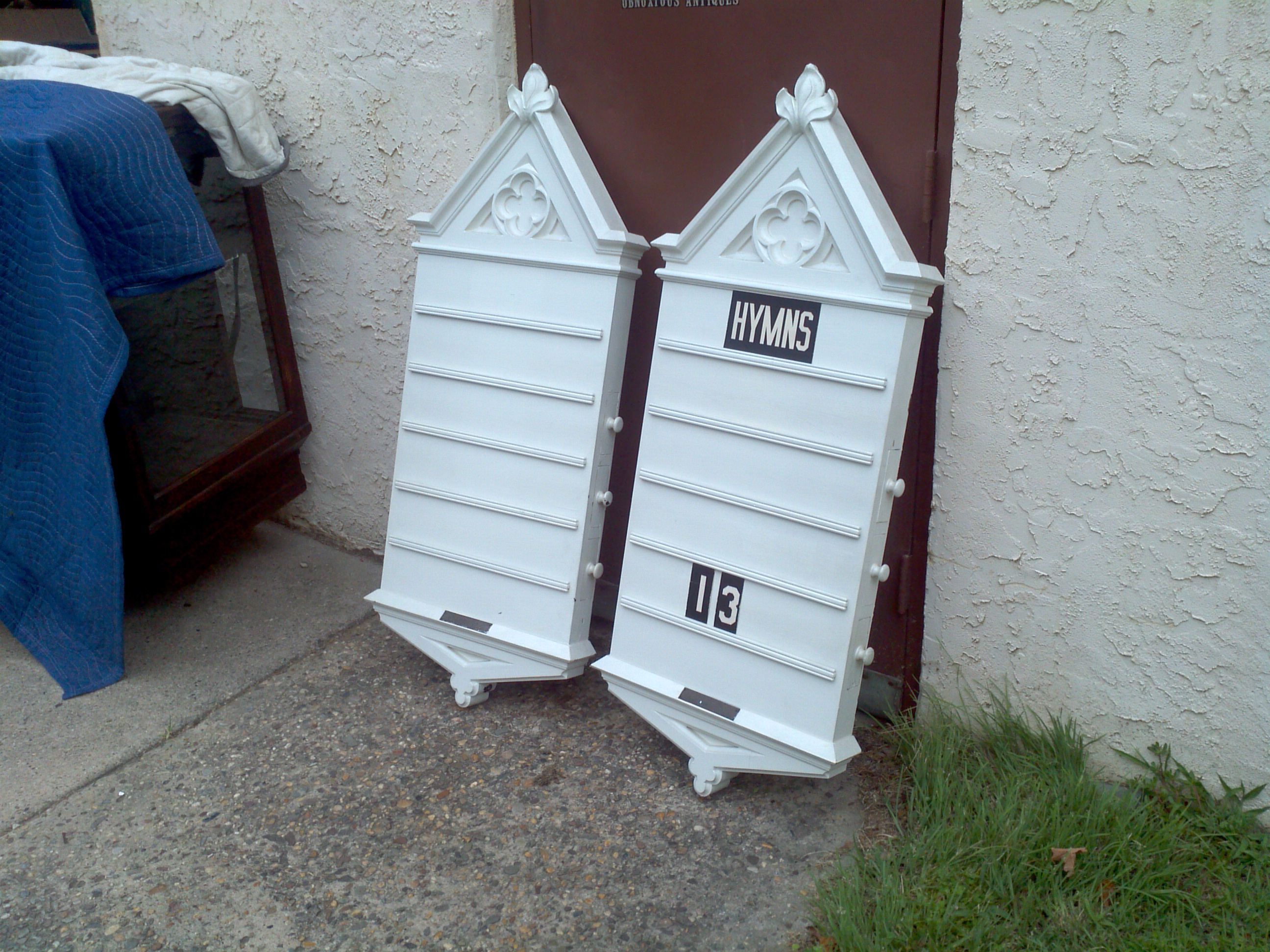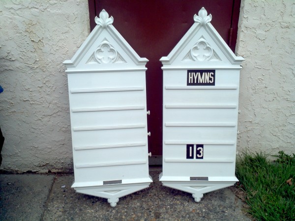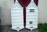 Antique painted oak 1920’s church hymn boards with letters measuring 27″ x 54″ from a now closed Reading, Pennsylvania church. Heavy but will need to be stripped to bring out the oaks beauty. Buy one or both. Will look good in the kitchen…….