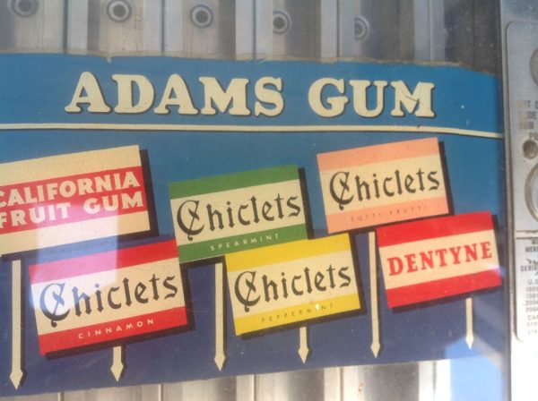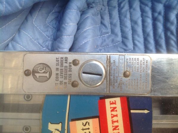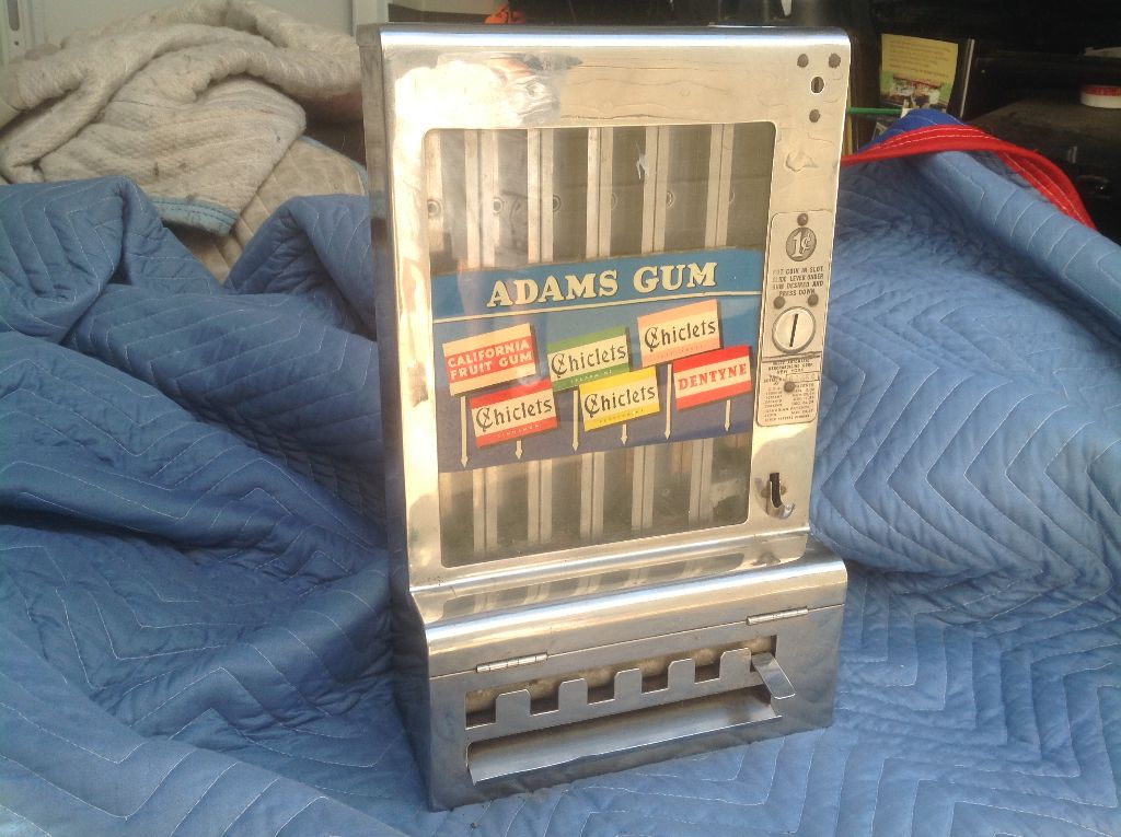 Vintage 1930’s penny operated one cent Adams gum machine in as found condition. Key missing with coins inside. Nice graphics. Polished aluminum…………