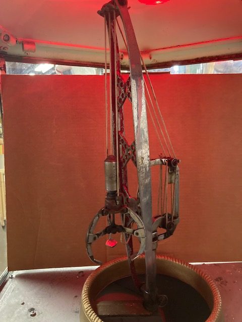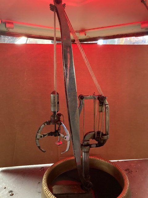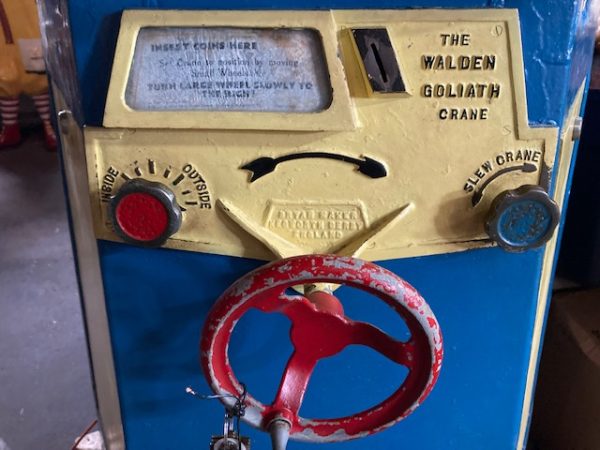 1935 all mechanical English penny coin operated penny arcade Walden Goliath crane in as found condition. Massive in size, working but may need some adjustment when finally placed. Operates on large size English Pennies and manual turning of crane to try for prize. Just a great piece. Try to find another. 5 pennies included to get you started along with keys……….