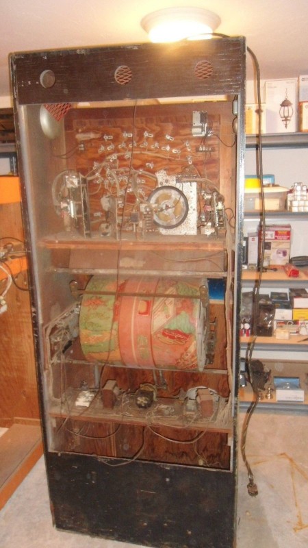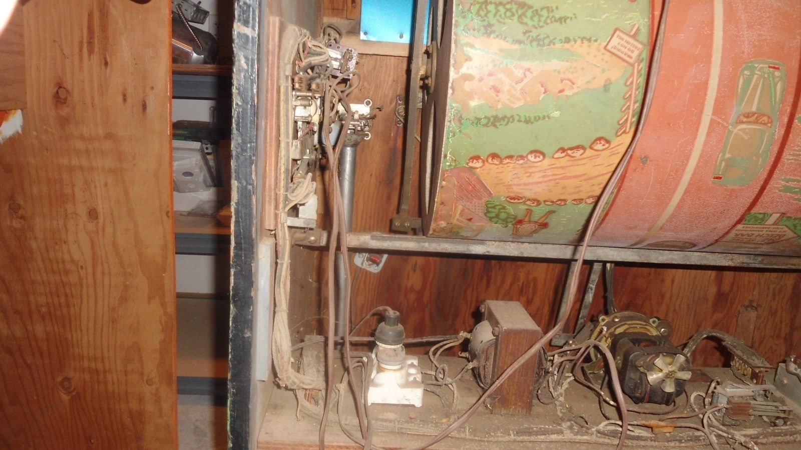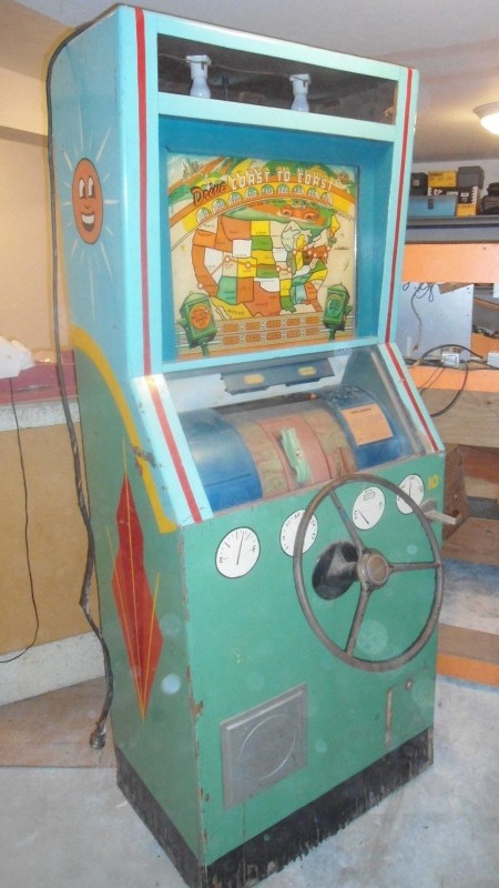 1940’s amusement park penny arcade Mutoscope Drive Mobile in as found condition. Cabinet shows some wear but the mechanical parts look to be all there. Someone added a speaker that’s not original to the machine. Top glass has been cracked and is missing the word Mutoscope but otherwise the glass is original and has the important section identifying “Drive Mobile. Some parts of the graphics have been updated and front wheels are misisng on the car. Has not been plugged in so not sure what features work. Missing the front clear glass but the large center screened glass looks to be in very good condition. Nice machine and hard to find…………