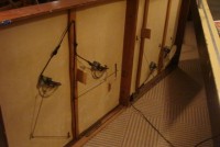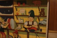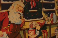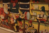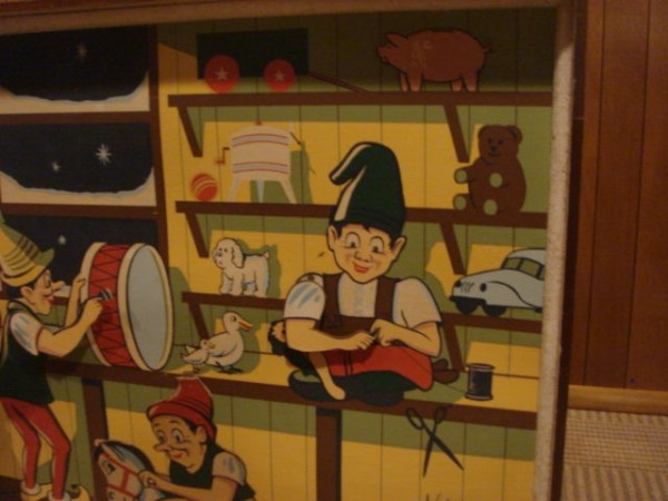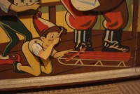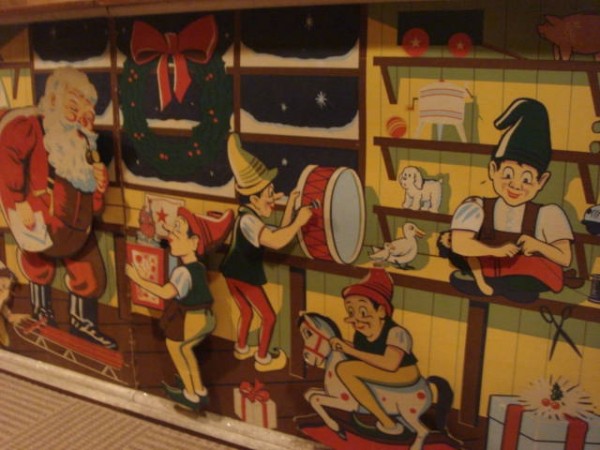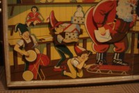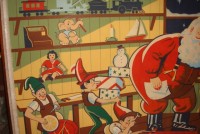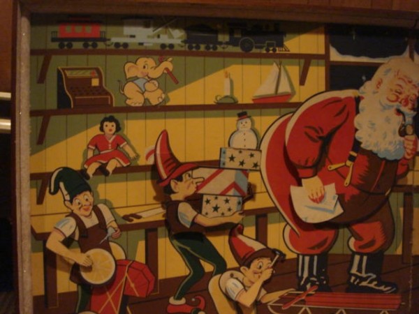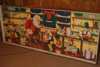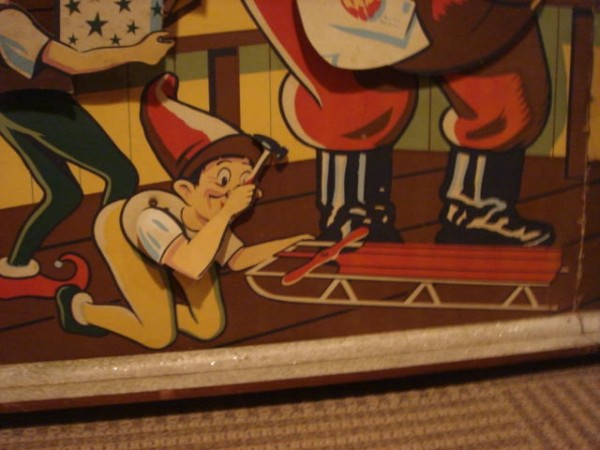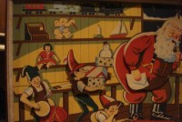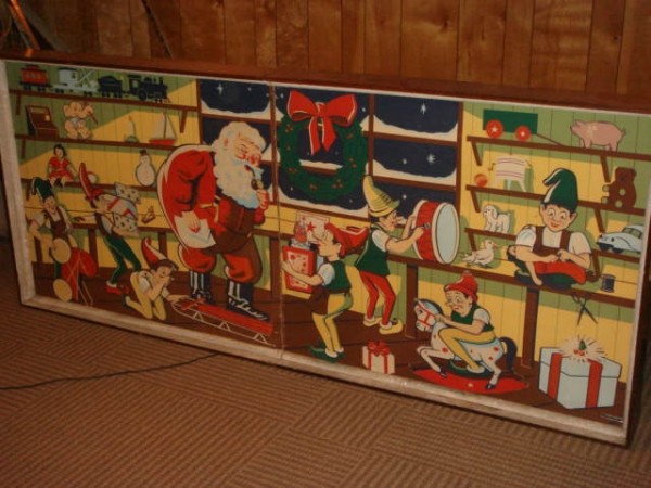 EXCELLENT condition. All of the characters are complete, the colors are still bright , no stains or cracks……I gave it a little “tune-up” and it operates perfectly. All of the little animation effects are cool…elf nailing the sled together, another elf paints a drum, one is spinning a wheel on a wagon (has a little ratchet mechanism so he keeps it spinning in the same direction not just back and forth…one sewing a doll, jack in the box clown pops up and down while Santa rocks his whole body back and forth and nods his head…elf on the rocking horse…..Uses these neat old solenoid “motors” with no moving parts to wear out…. Even has the original cord and tag still on it. Two wood frame sections are in great shape and bolt together and have a fuse protected link. Edge of the wooden frame is covered in those old snow crystals that looks like sugar……. Just a great example!