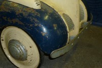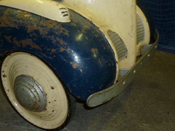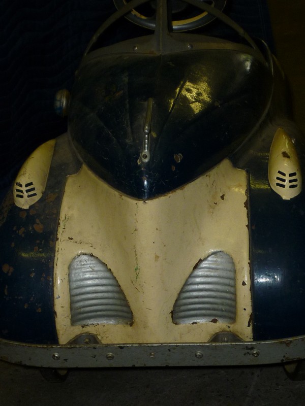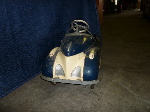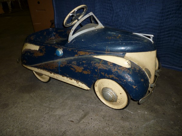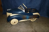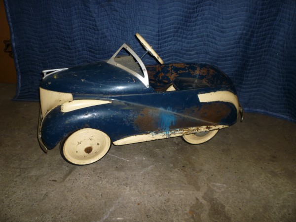 1940’s vintage solid metal pedal car in nice condition, missing one hub cap. Repainted over the years with no rot. Includes the original spring loaded bell. A good restoration project or display as is…………