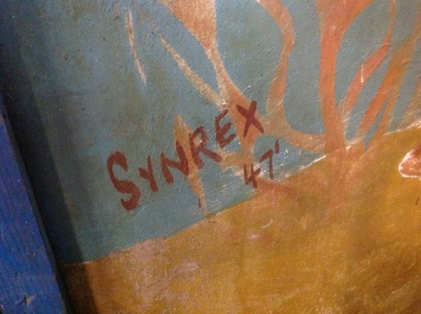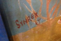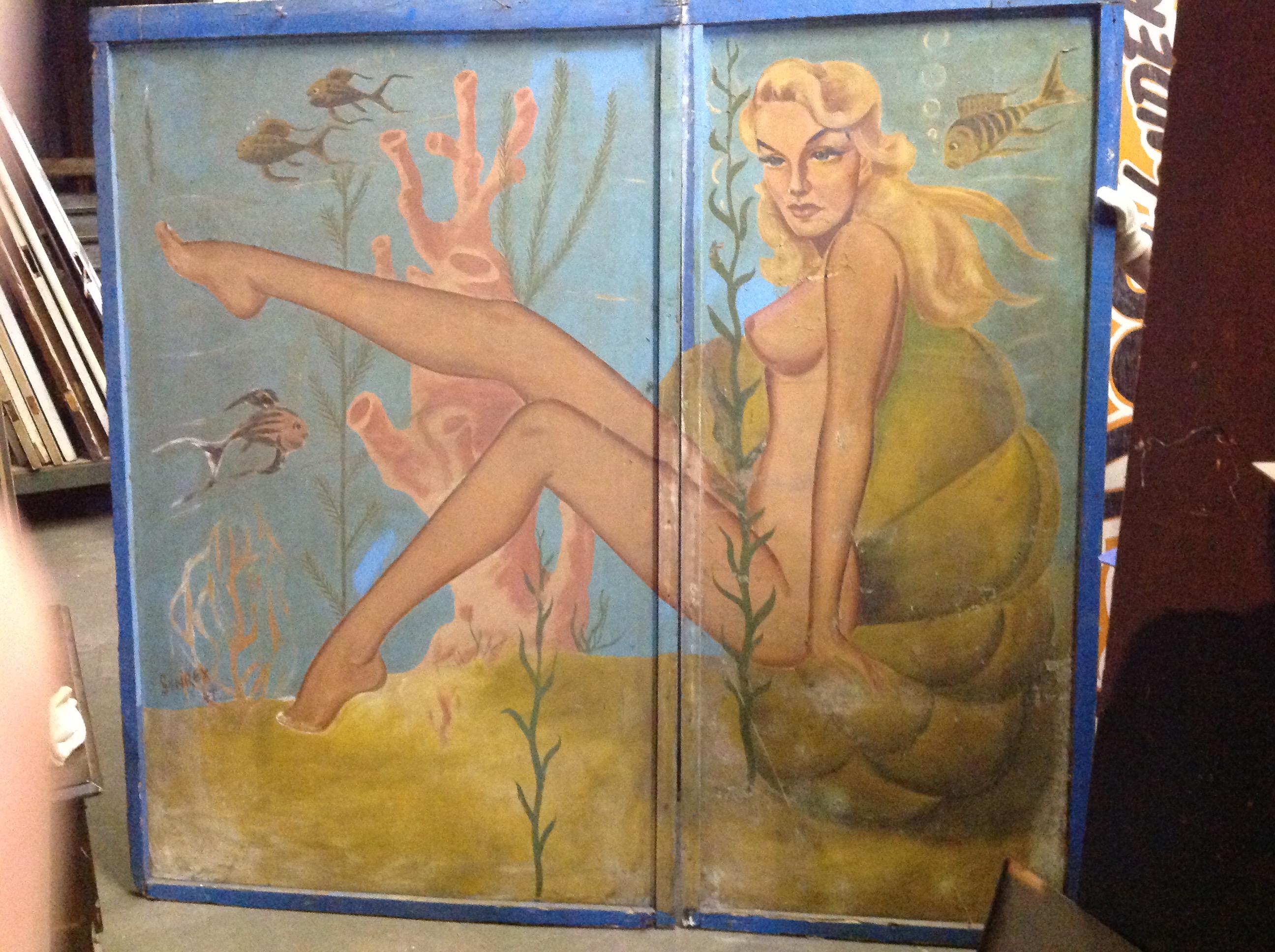 Vintage sideshow Mermaid Girl wood show panel measuring almost 8′ tall x 7″ wide in as found condition. Painted in 1947 by artist Synrex and used in a Girly traveling sideshow. Shows some signs of age and wear but overall the colors are bright and the wood in fair to good condition. Nice example of early sideshow art. Would make a nice addition to any collection……..