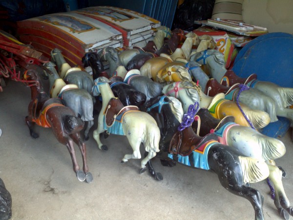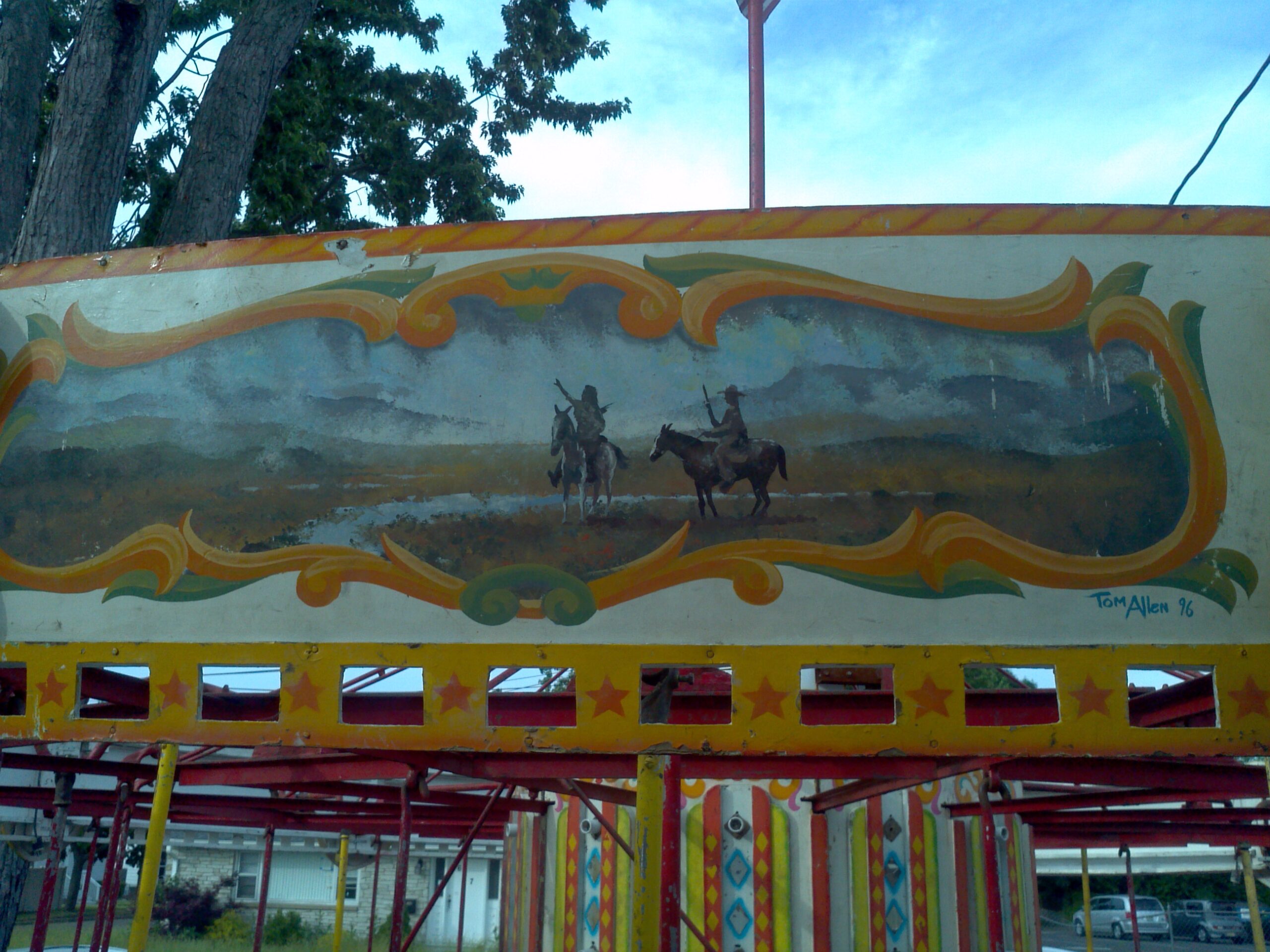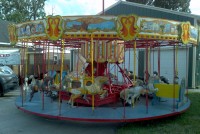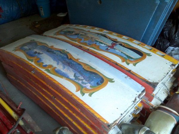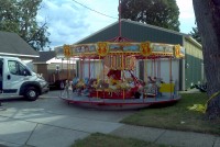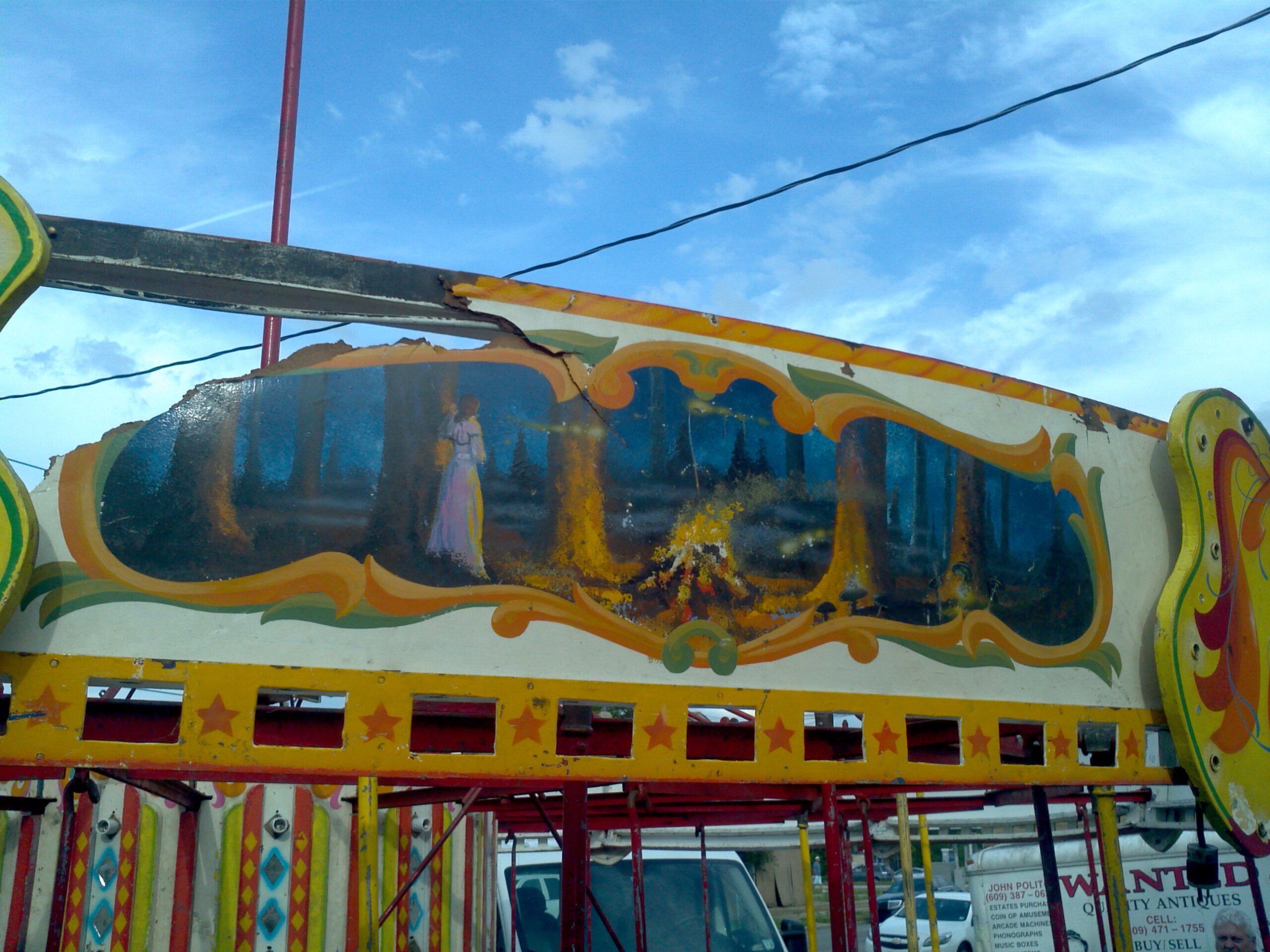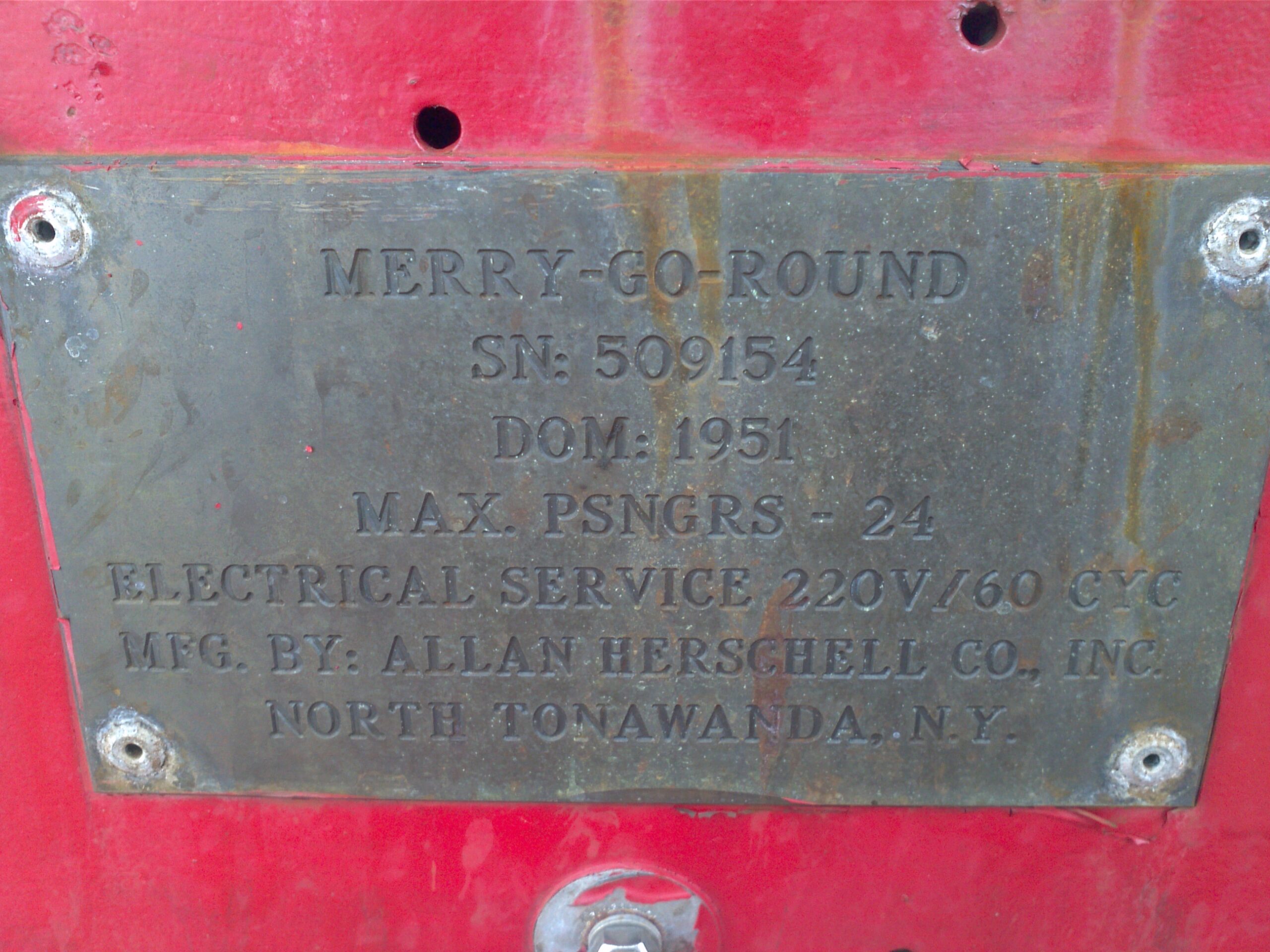 Out of storage and now ready for sale, 1950’s Allan Herschell traveling, trailer mounted, childs carousel in working condition. Last used at Salisbury Beach MA. Carousel measures 20′ diameter x 14′ tall not including pole with American flag. Rounding boards will need some restoration as well as the shields needing some new light sockets. The canvas top is missing but a new one can be made at an additional charge. All the metal parts are good and the sweep has a new electrical connection. Trailer tires are good and unit can be towed. 20 aluminum child sized horses and 2 chariots. Chariots will need seat adjustments. Overall, the unit is in very good condtion for it’s age but will need some restoration to bring it up to code. Please ask questions. Email or call………..