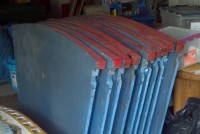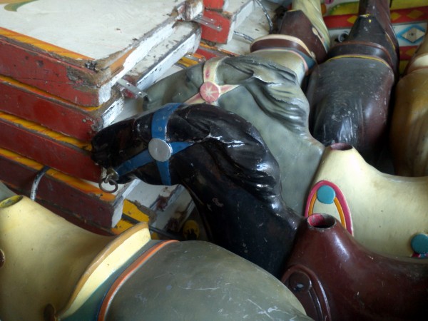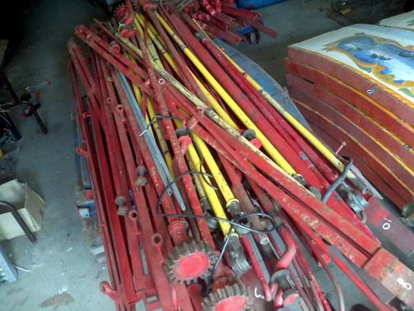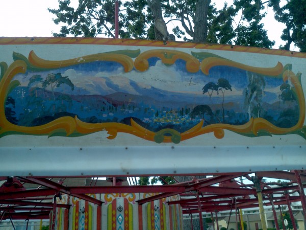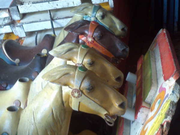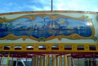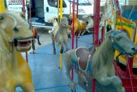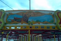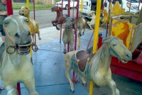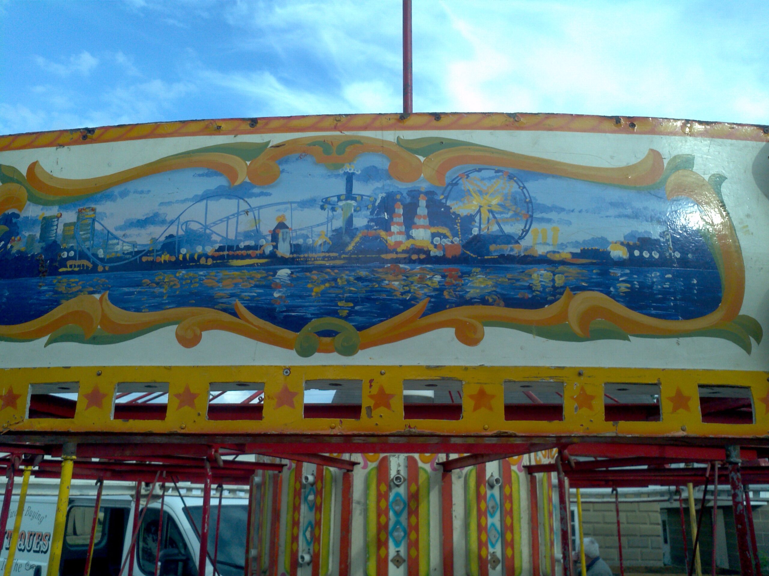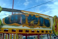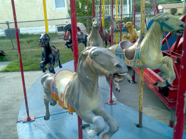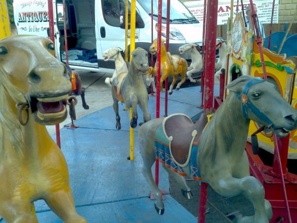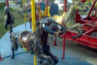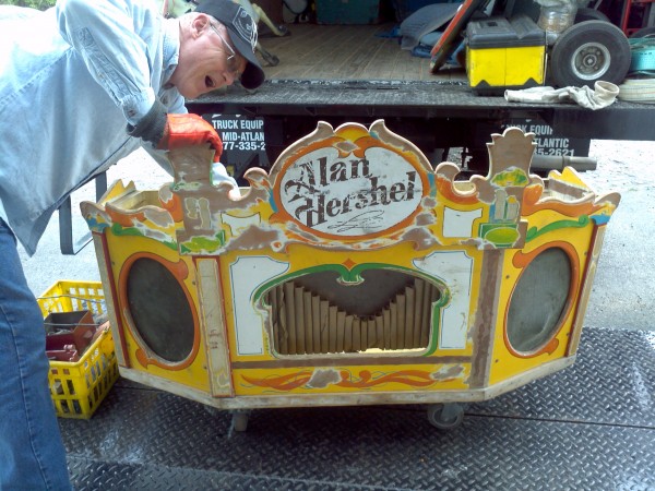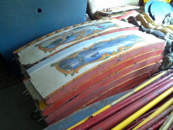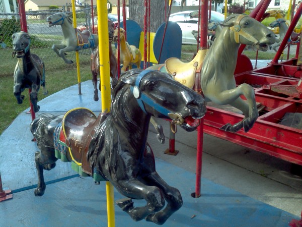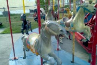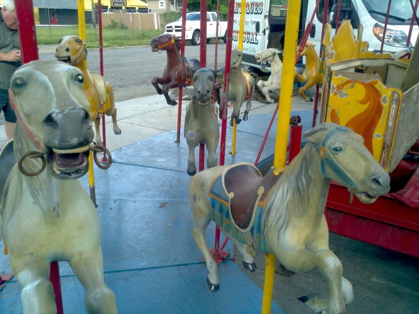 Out of storage and now ready for sale, 1950’s Allan Herschell traveling, trailer mounted, childs carousel in working condition. Last used at Salisbury Beach MA. Carousel measures 20′ diameter x 14′ tall not including pole with American flag. Rounding boards will need some restoration as well as the shields needing some new light sockets. The canvas top is missing but a new one can be made at an additional charge. All the metal parts are good and the sweep has a new electrical connection. Trailer tires are good and unit can be towed. 20 aluminum child sized horses and 2 chariots. Chariots will need seat adjustments. Overall, the unit is in very good condtion for it’s age but will need some restoration to bring it up to code. Please ask questions. Email or call………..