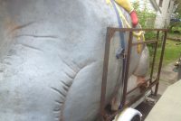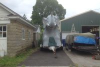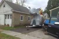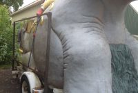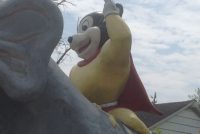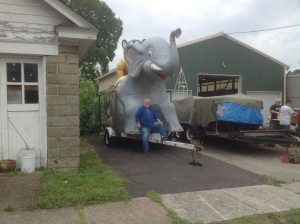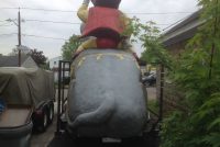 Here’s an opportunity to own one of the most unusual advertising items ever offered by Obnoxious Antiques. Manufactured by F.A.S.T. in the 1950’s and last used as an entrance display in a now closed amusement park. Elephant and Mighty Mouse are in nice condition and being sold in as found condition with its own trailer included. Trailer measures almost 16′ long and 13′ from blacktop surface to top of Mighty Mouse head. Use as is or repaint for a brighter look. Add advertising sides and put her on the road. You will attract customers……………