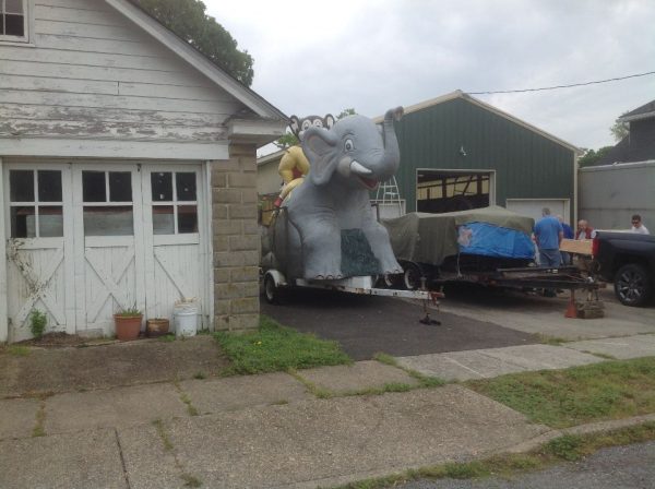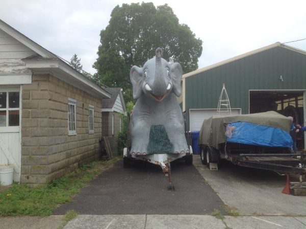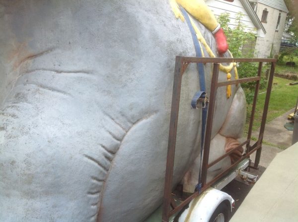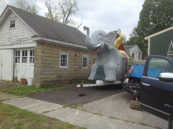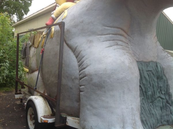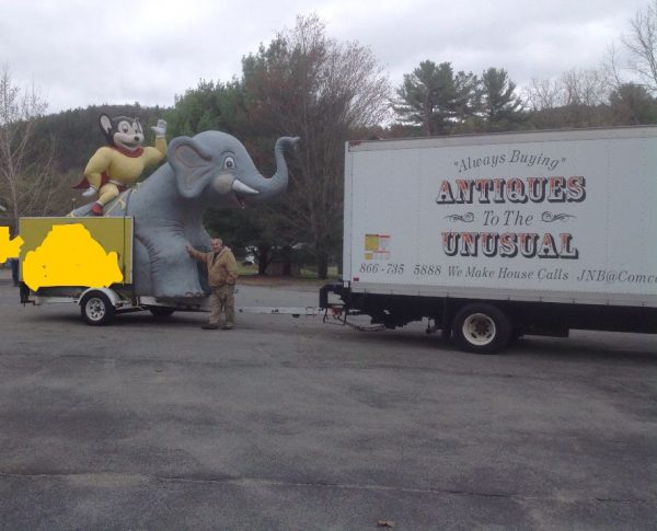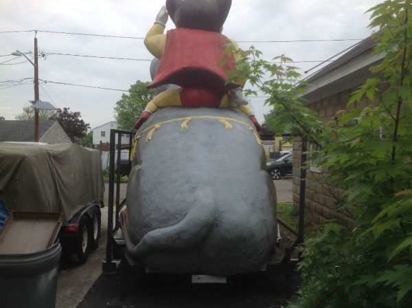 Here’s an opportunity to own one of the most unusual advertising items ever offered by Obnoxious Antiques. Manufactured by F.A.S.T. in the 1950’s and last used as an entrance display in a now closed amusement park. Elephant and Mighty Mouse are in nice condition and being sold in as found condition with its own trailer included. Trailer measures almost 16′ long and 13′ from blacktop surface to top of Mighty Mouse head. Use as is or repaint for a brighter look. Add advertising sides and put her on the road. You will attract customers……………