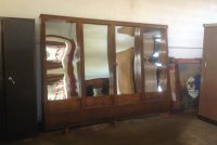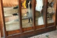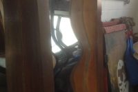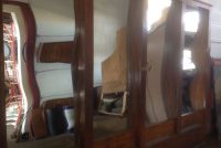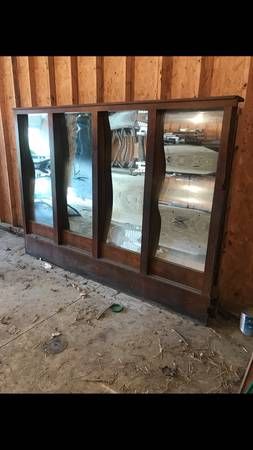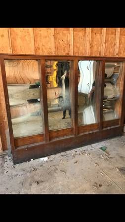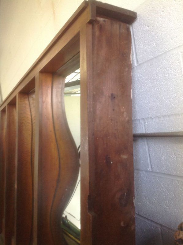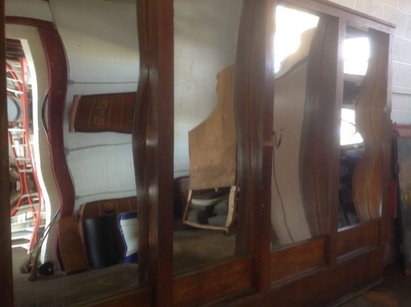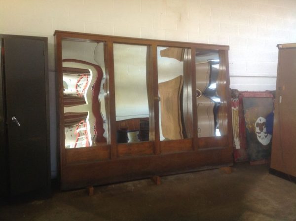 Antique oak 1950’s amusement park fun house mirror wall in as found condition. Measuring about 12′ long, the wall contains 4 glass mirror’s in various distortions, big, tall, skinny and fat. Will need minor woodwork tightening but overall in very good condition. Rare item……………….