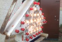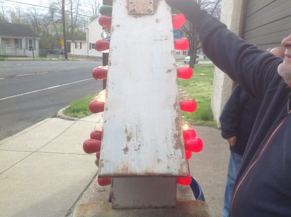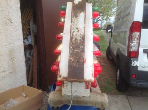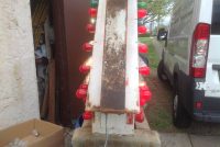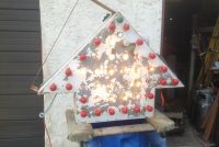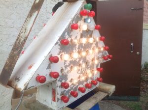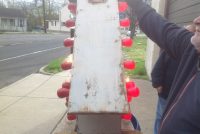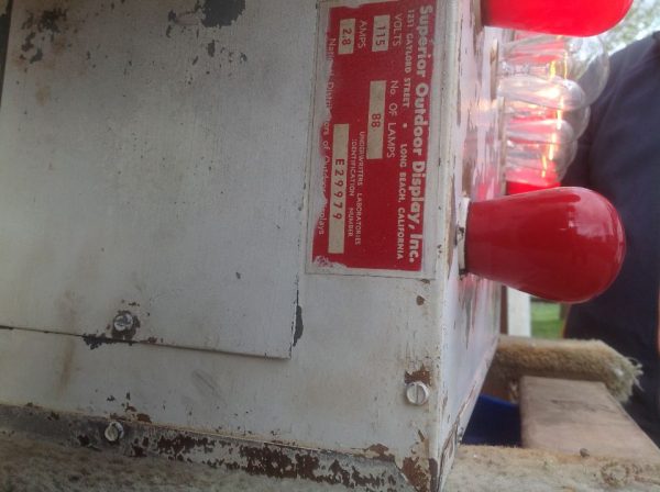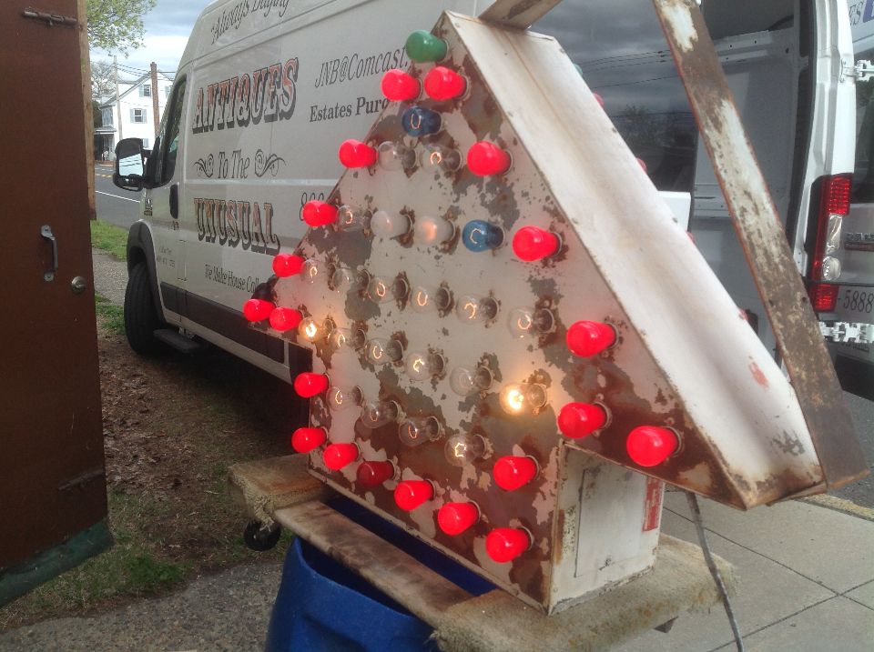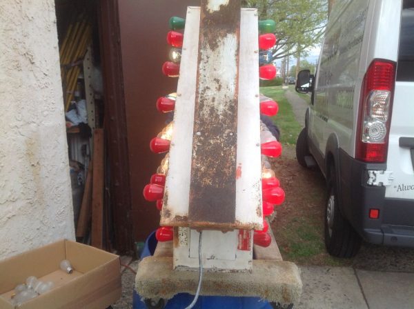 Vintage 1950’s mid century double sided flashing arrow with bulbs in as found condition. Nice overall shape and works well. White paint flaking from age. Bracket for mounting included……….