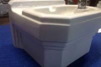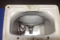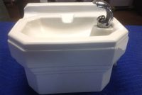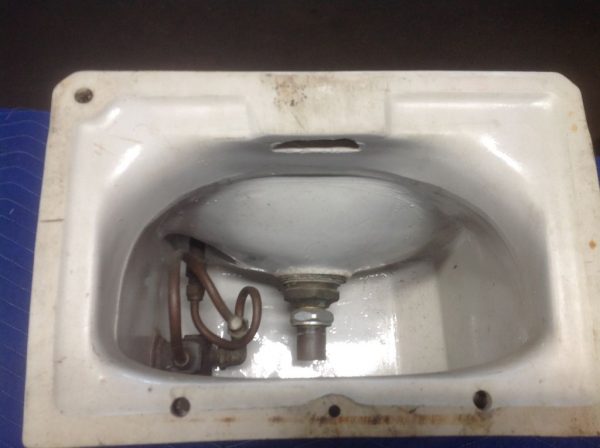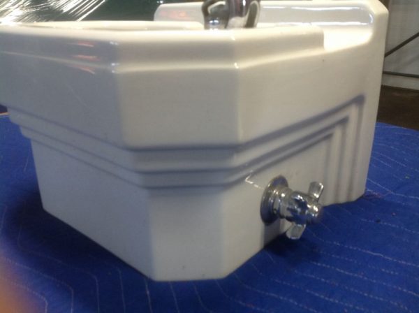 1950’s mid-century porcelain school water fountain in as found condition. Measure 15″wide x 14″tall x 14″deep. Bubbler fountain with spring loaded knob in perfect condition.
