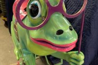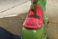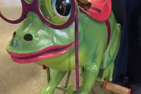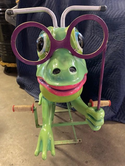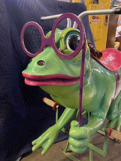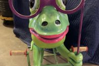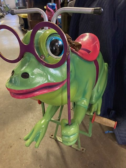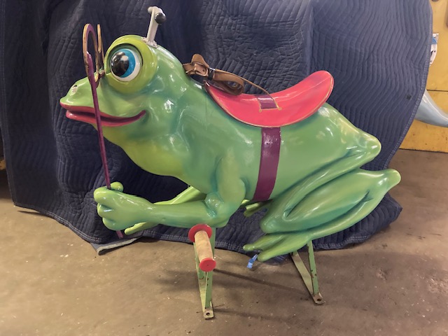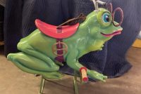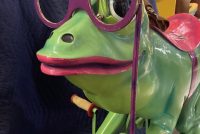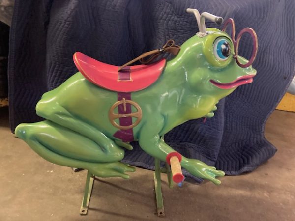 1950’s Mid-Century wooden Carousel Merry Go Round Frog by Bernard Kindt in as found condition. Frog along with other animals for sale were recently found in a barn stored away for 25 years. Hard to find figures highly sought after by collectors. Bernard Kindt was a noted Belgian sculptor who specialized in making wood carousel animals and animated cartoon characters. Frog is in condition showing some minor wear. Froggy needs a new home………..