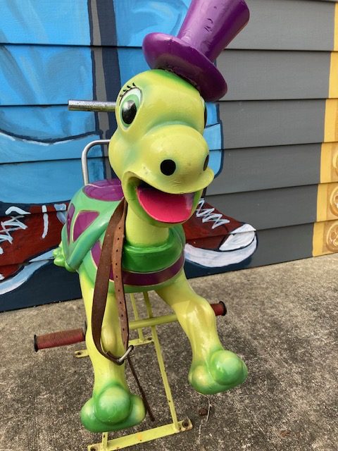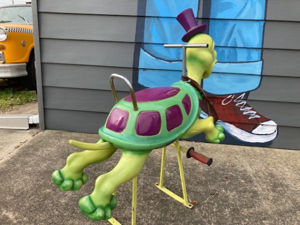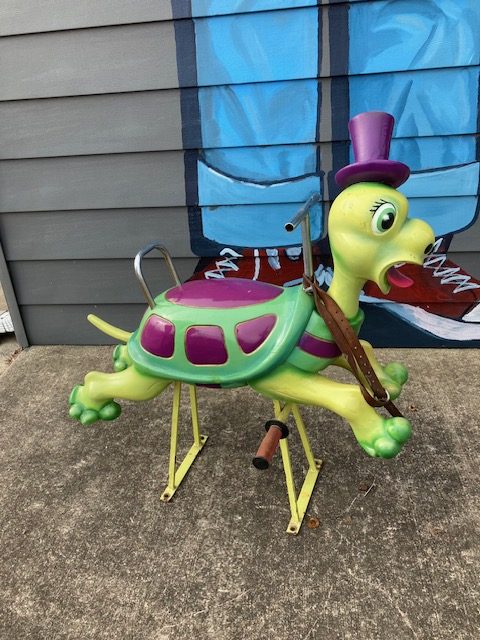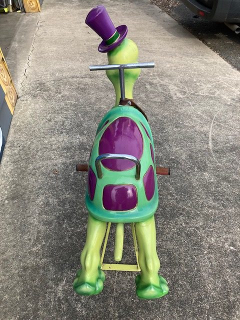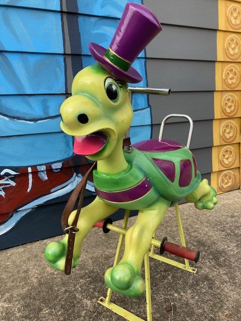 1950’s Mid-Century wooden Carousel Merry Go Round Turtle by Bernard Kindt in as found condition. Turtle along with other animals were recently found after being in storage for 25 years. Hard to find figures, highly sought after by collectors. Bernard Kindt was a noted Belgian sculptor who specialized in making carousel animals and animated cartoon figures. Nice figure with some minor scuffs. He really moves at a snails pace………