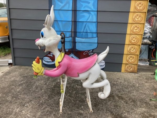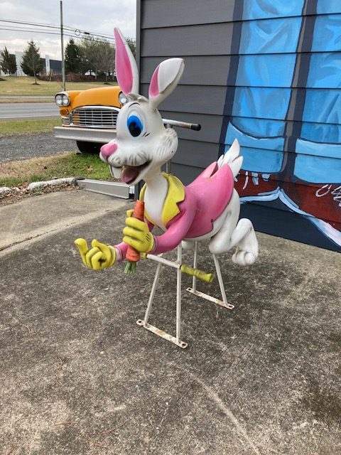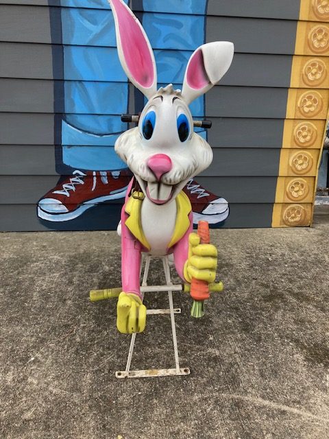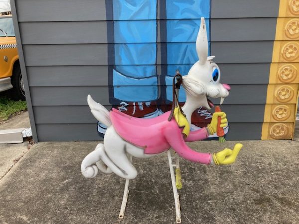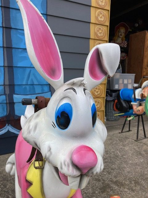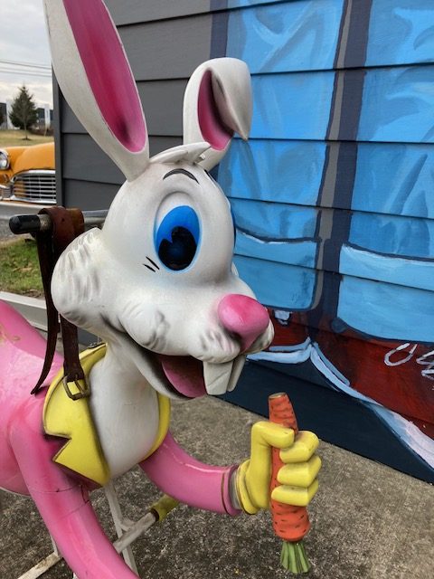 1950’s Mid-Century wooden Carousel Merry Go Round Rabbit by Bernard Kindt in as found condition. This and others we have for sale were discovered in a barn in Upper PA after being in storage for over 25 years. Bernard Kindt was a noted Belgian sculptor who specialized in making wood carousel animals and animated cartoon characters. Highly sought after by collectors. Very hard to find. Decent shape overall with some minor paint chips………