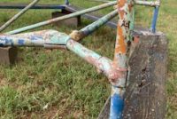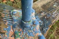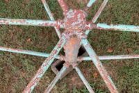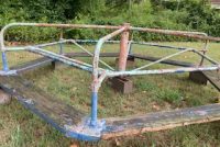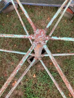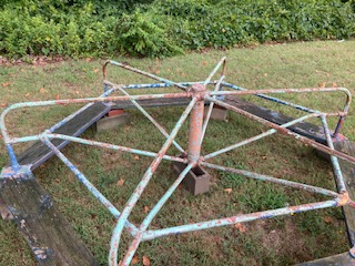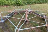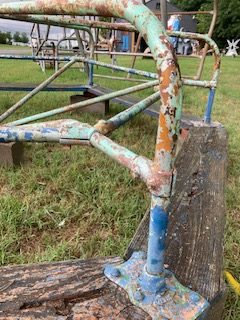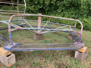 Vintage 1950’s Midcentury Merry Go Round child’s playground ride in as found condition. Rides will need some minor restoration but overall in very nice shape complete with center pole. Large and heavy steel construction measuring about 10′ wide. Any questions, just ask………..