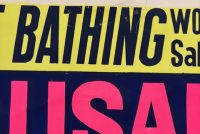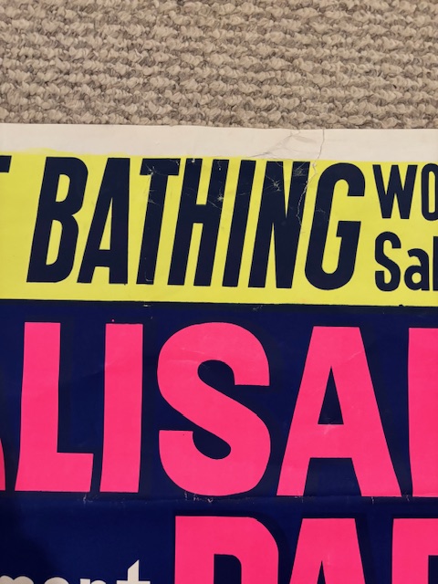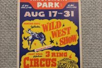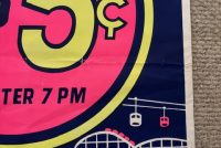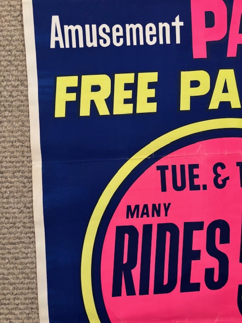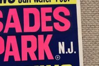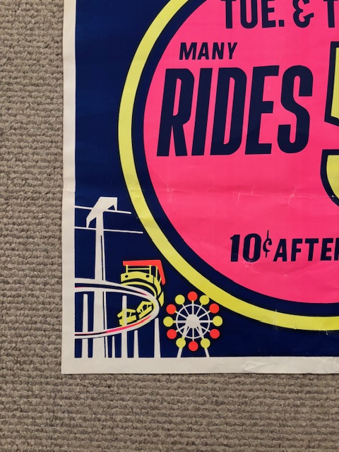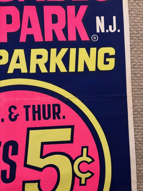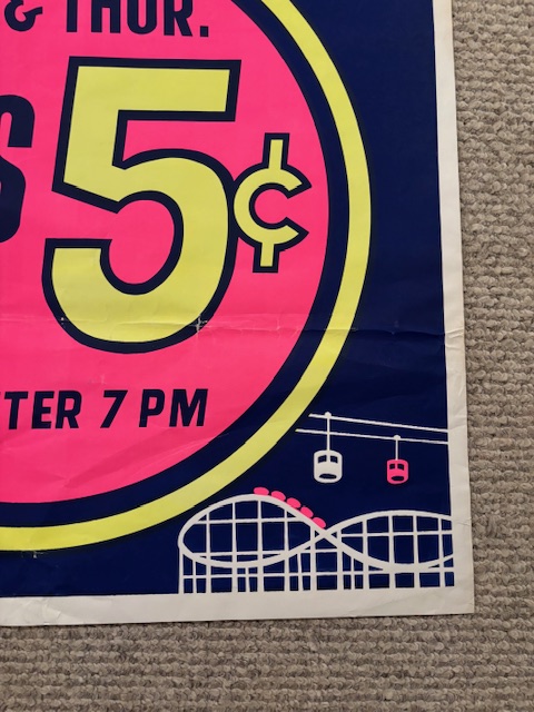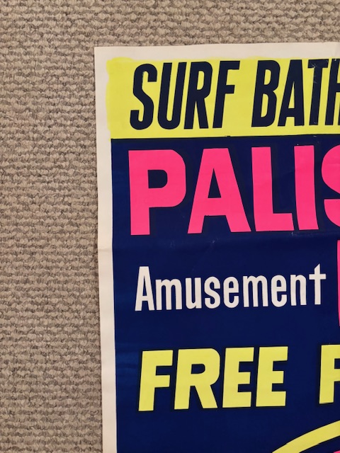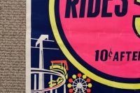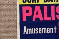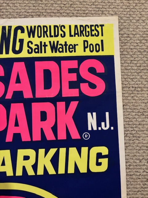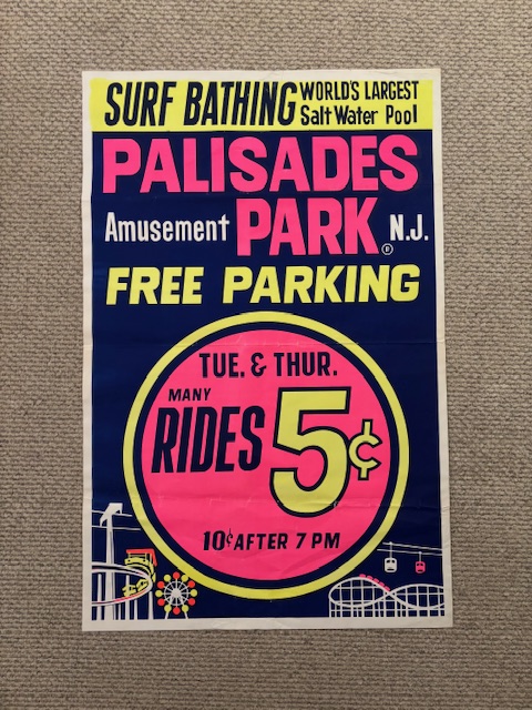 Large poster promoting the famous and now closed Palisades Amusement Park of NJ. This poster advertises their world’s largest salt water pool, free parking and their deals for rides at just five cents. Measures 29.5×45”