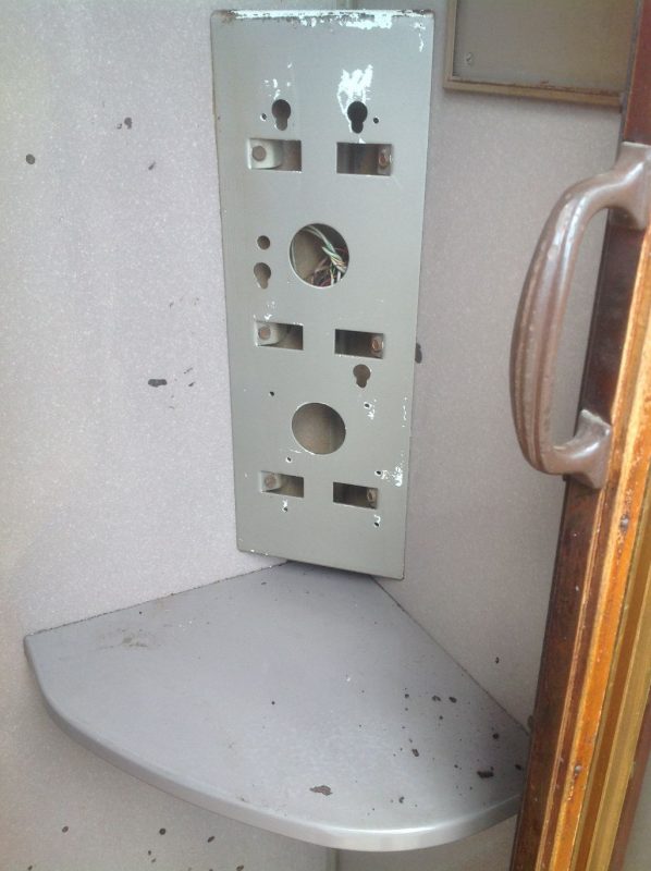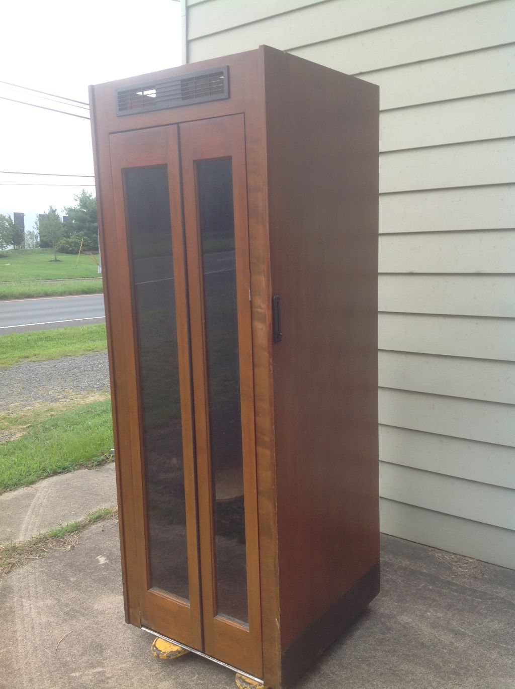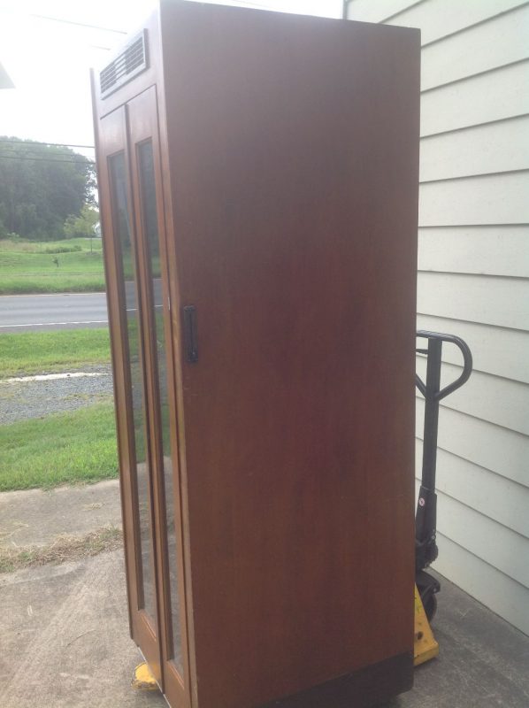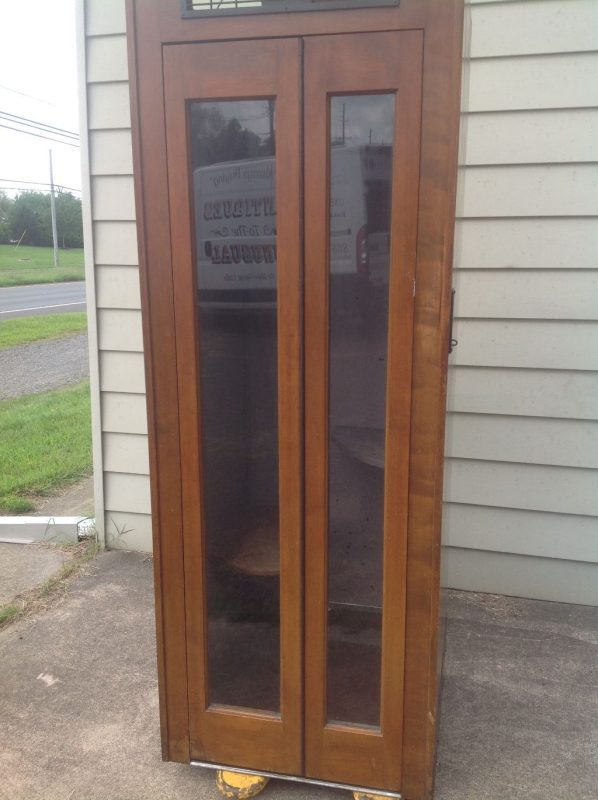 Vintage 1950’s, all wood telephone booth in as found condition. Working fan and light. All it needs is a phone and a place in your game room or man cave………..