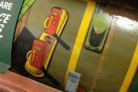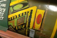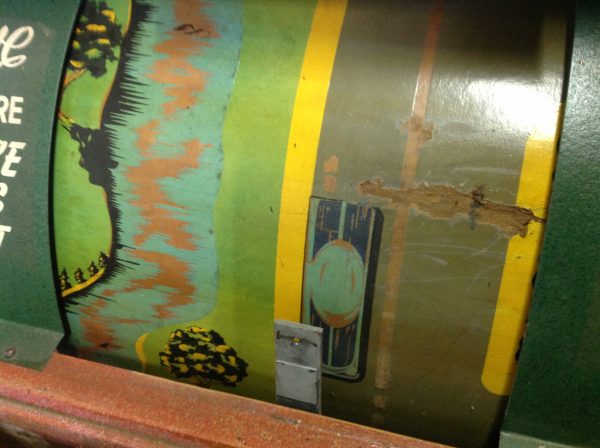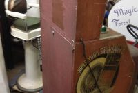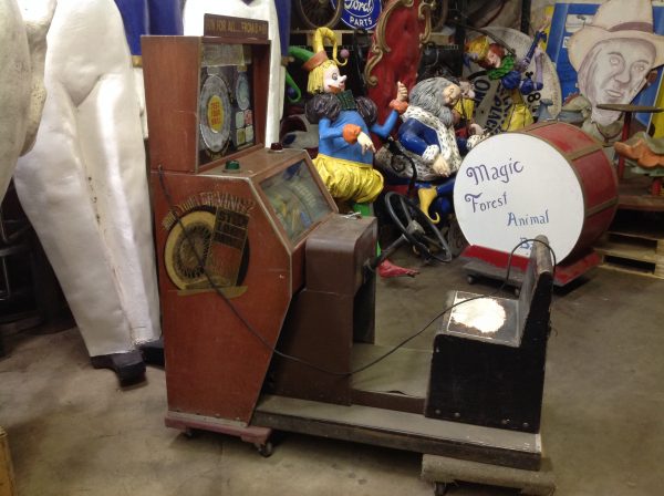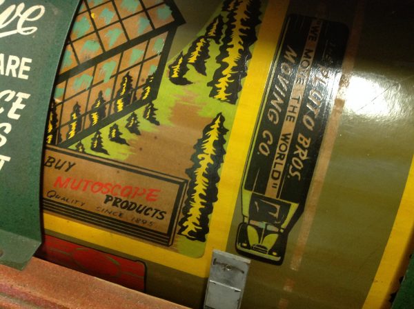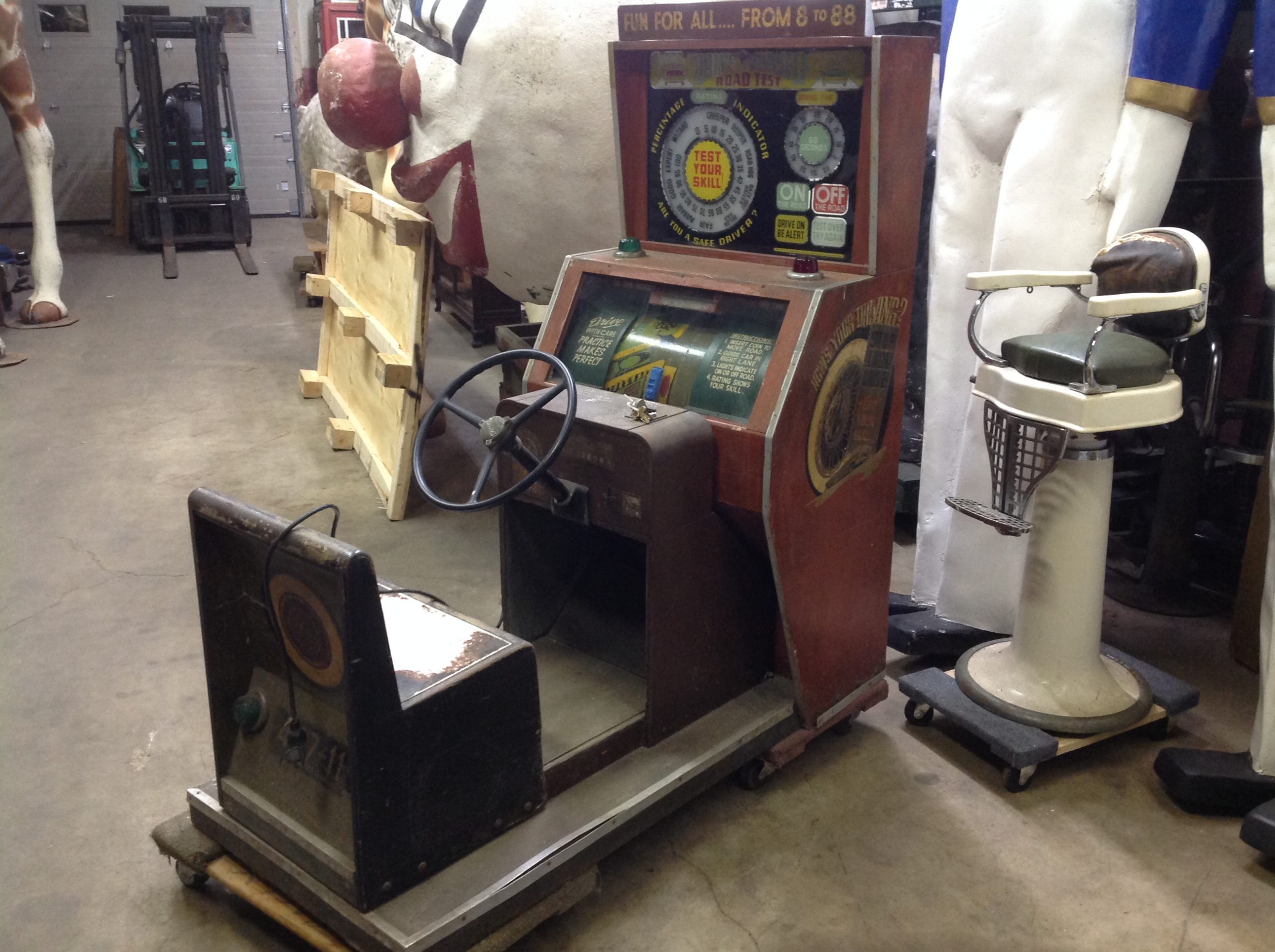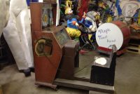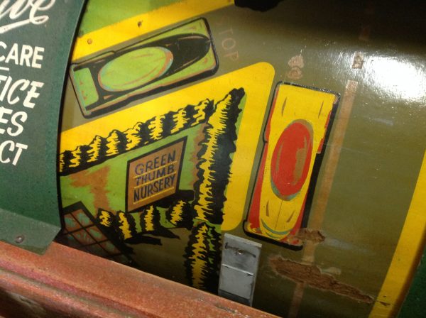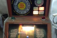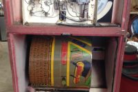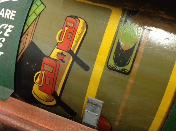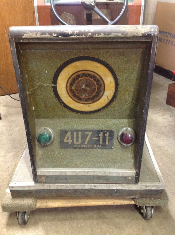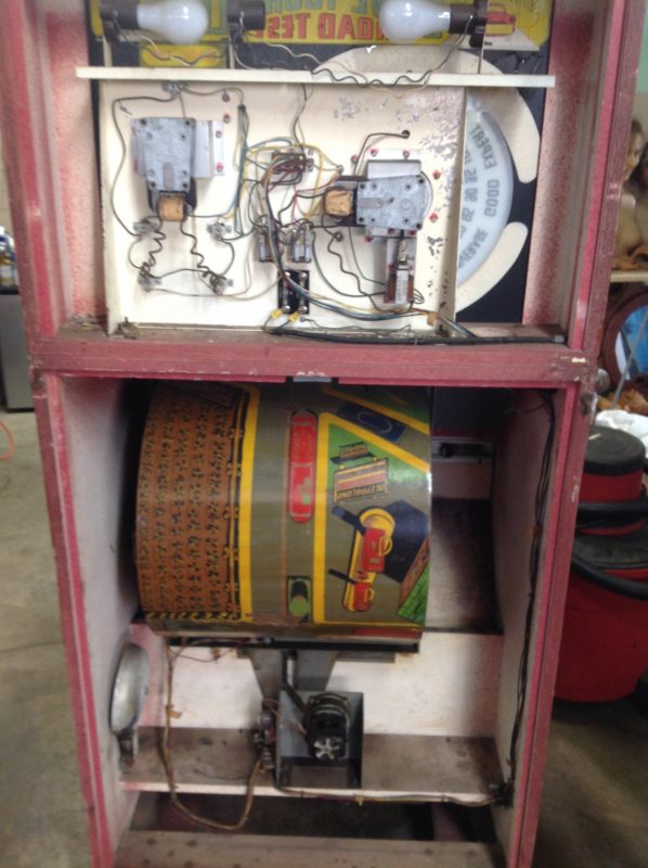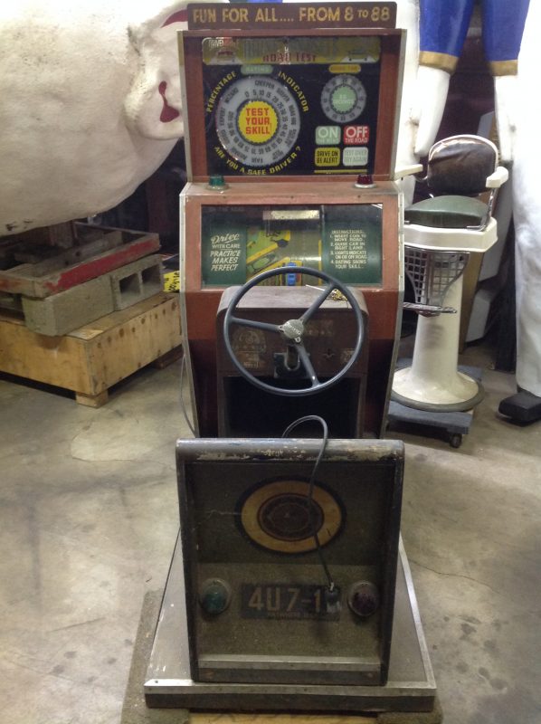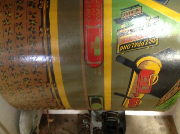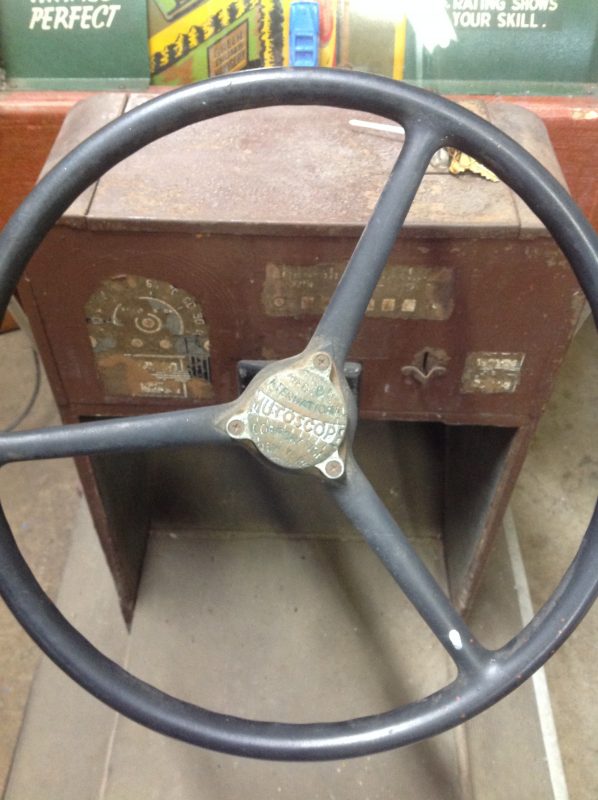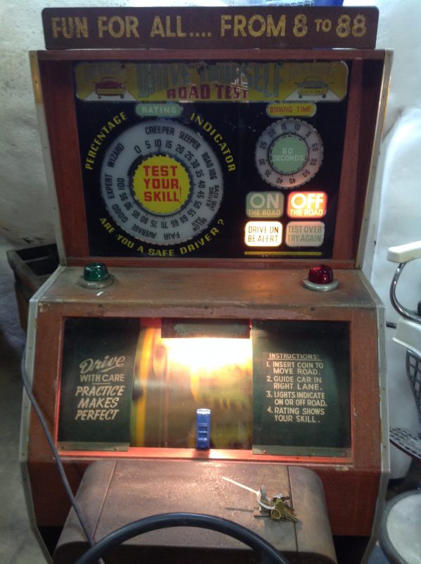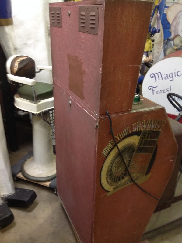1040’s coin operated International Mutoscope sit down Drivemobile in as found condition. Overall in nice condition with slight peeling on backglass. Will need servicing but does light up, barrel turns and scores at times. Nice graphics. Rare and hard to find arcade machine…………