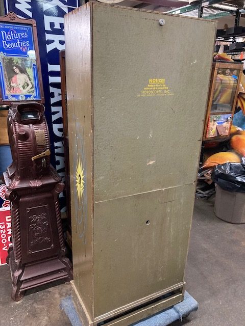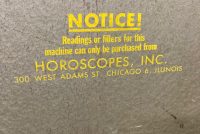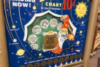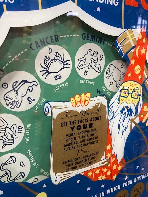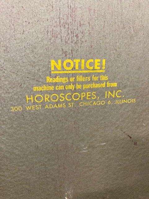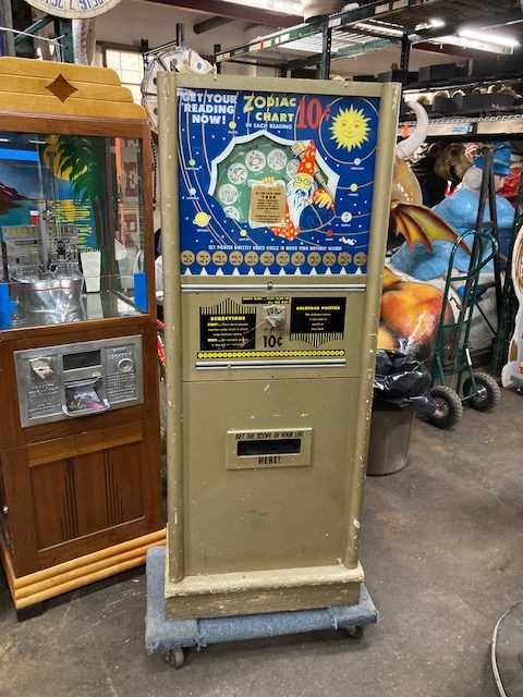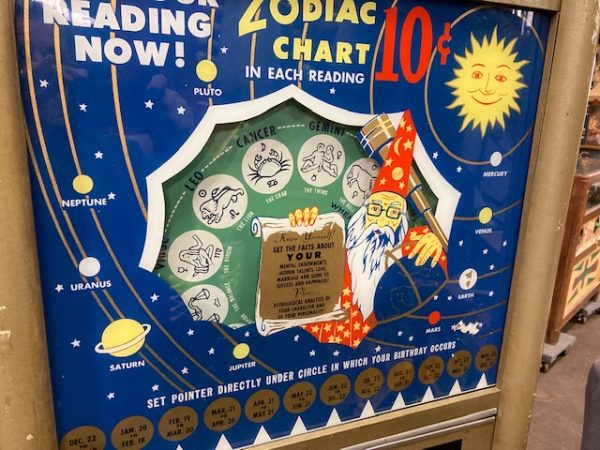 1956 10 cent penny arcade coin operated Zodiac Astrological Reading vending machine in as found condition. Working order, animated screen with a good supply of monthly astrological vending packets. Hard machine to find……….