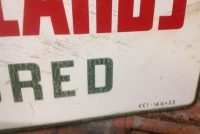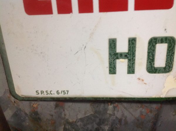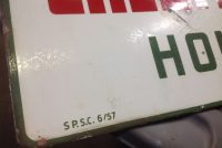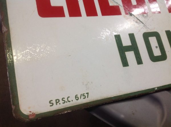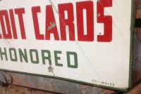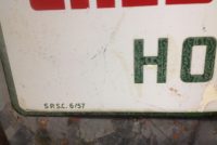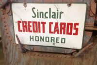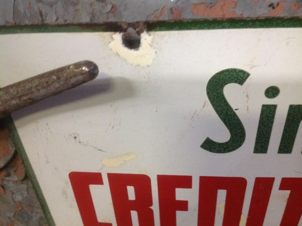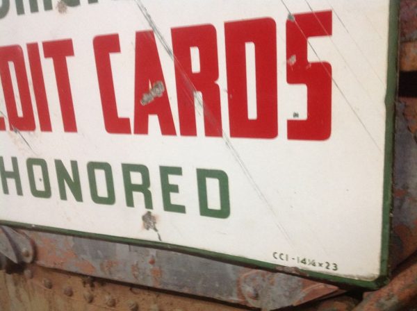 Vintage double sided porcelain Sinclair Gas Station credit card sign in as found condition. Sign is dated 6/57 and measures 14 1/4″ x 23″ with a few surface scratches and dings. Nice sign overall………….