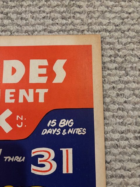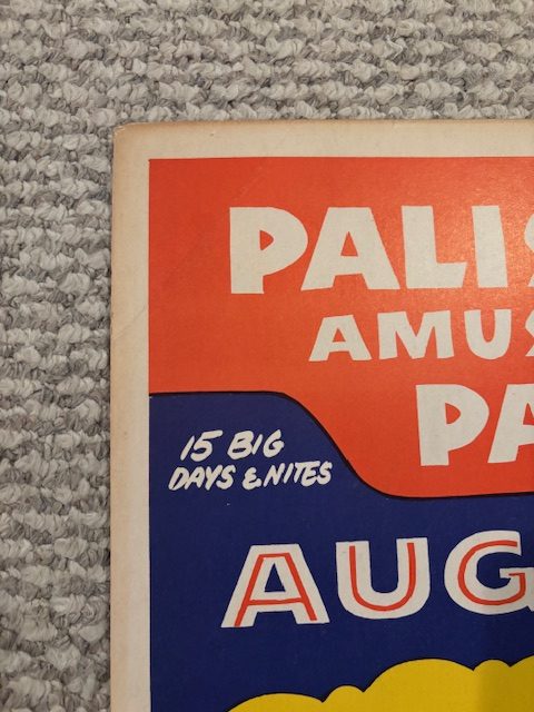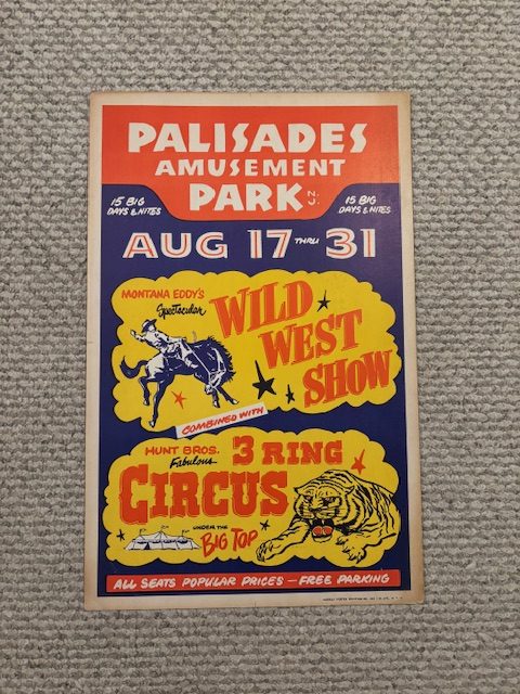 Card stock advertising poster for the legendary Palisades Amusement Park of NJ. Featuring Montana Eddy’s Wild West Spectacular and the Hunt Brothers 3 Ring Circus.