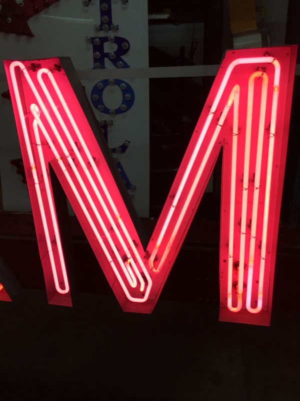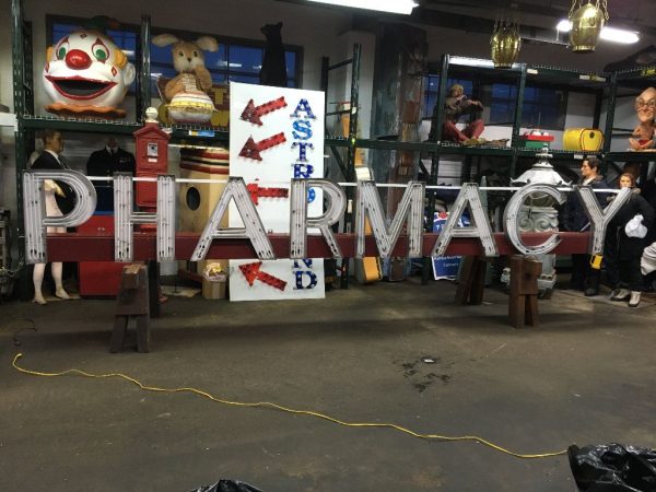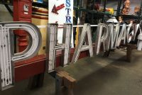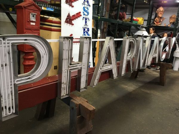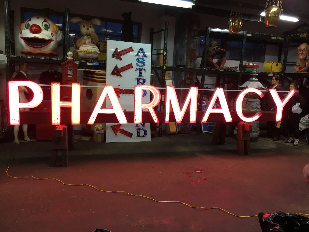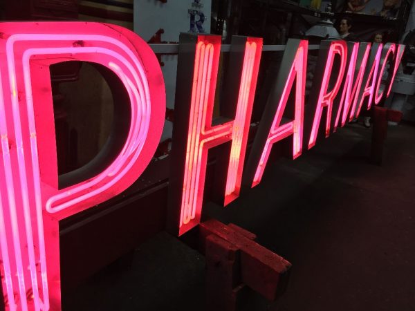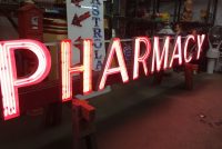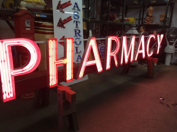 1960’s mid-century Pharmacy neon sign in as found working condition. Red neon sign measuring over 20′ long x 32″ high x 12″ wide