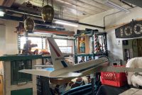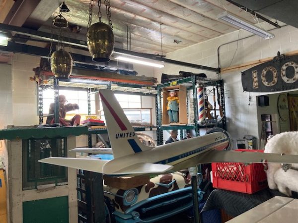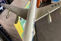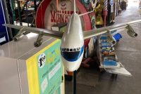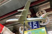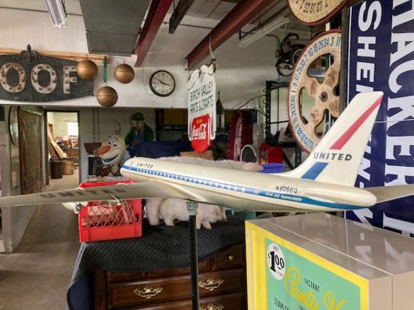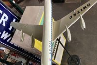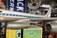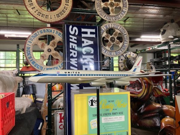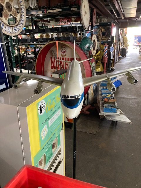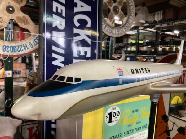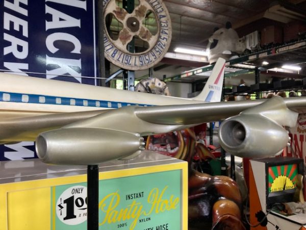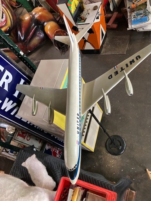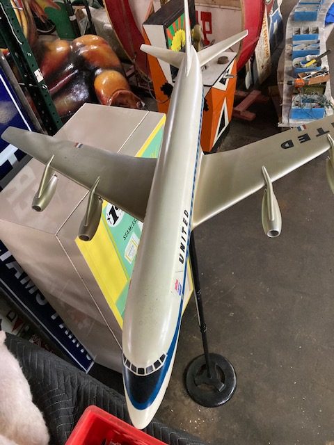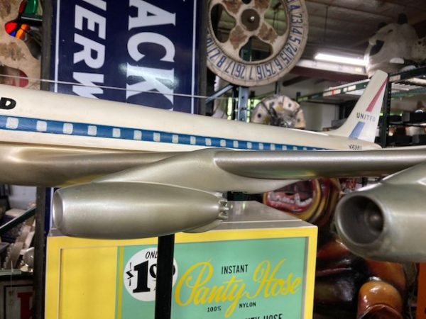 1960’s travel agency DC-8 Jet Mainliner display plane in as found condition. Plane measures 54″ long with a 53″ wingspan. DC-8 plane is one of the largest travel agency display planes made. Nice overall condition, complete with stand……….