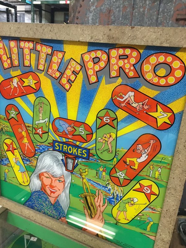 Vintage 1964 penny arcade Southland Little Pro Golf pinball game in as found working condition. Beautiful condition with only a small piece of formica trim missing from top right rail.  Clean, bright colors with a great looking backglass. Hard to find in this condition………….