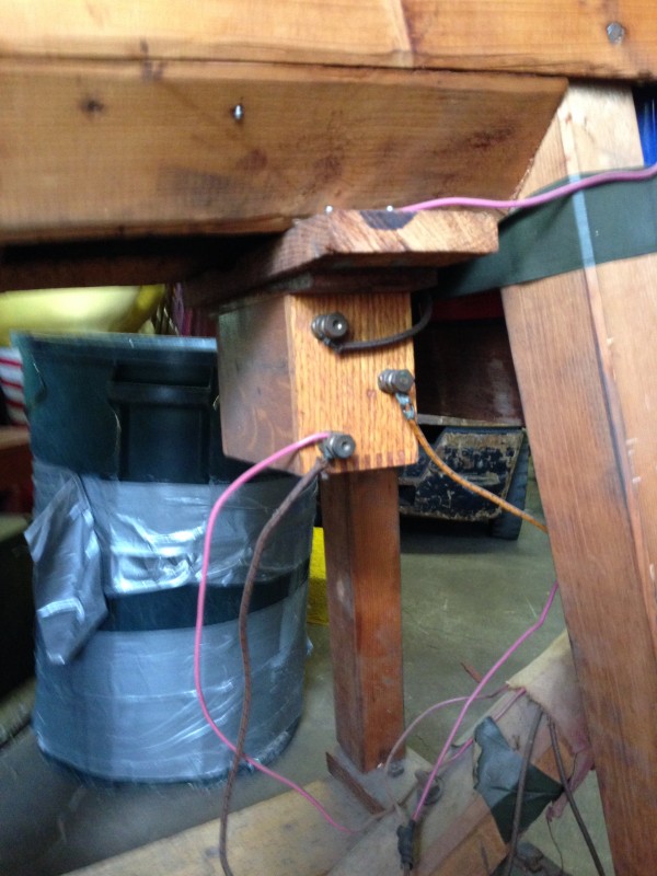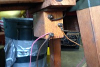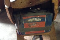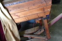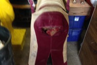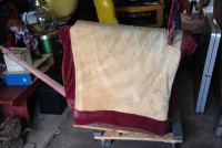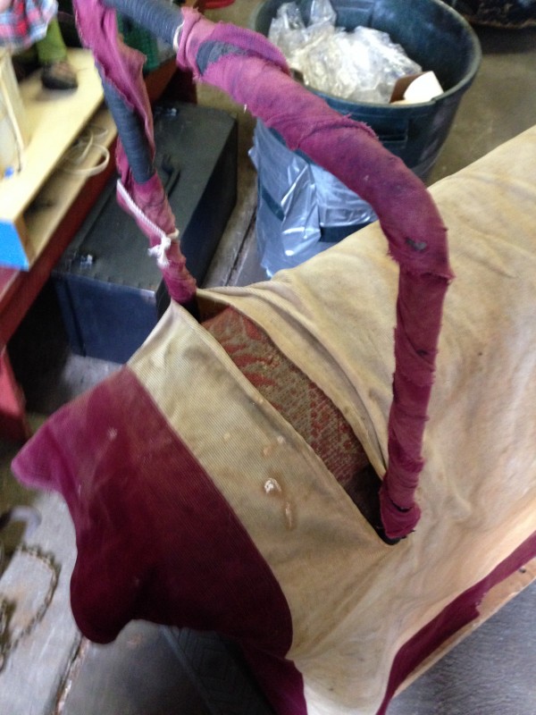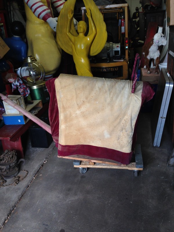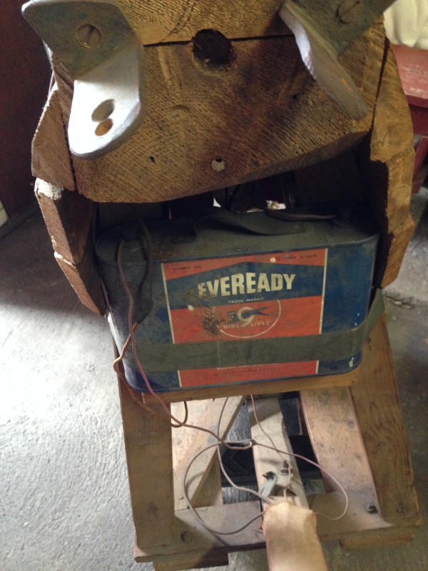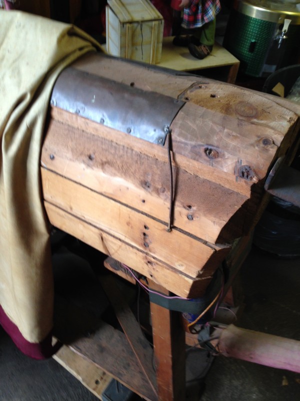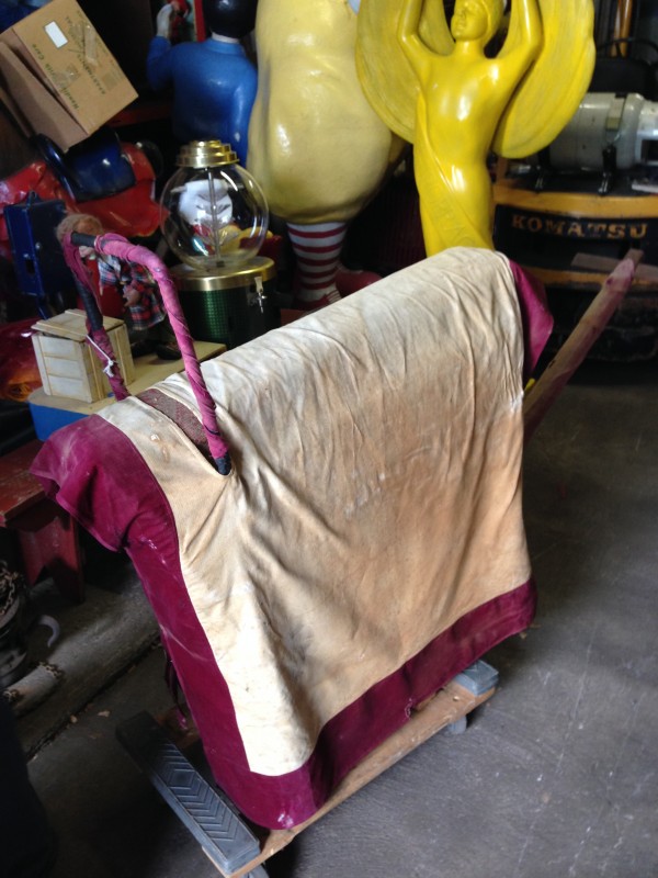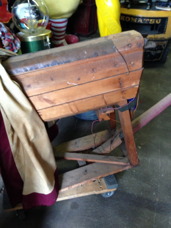 Odd fellows ceremonial iniation horse in as found condition with original cover. Object of the horse is to wet the cover as the person riding is shocked from the dry cell battery and copper strips beneath the riders behind. Rider is blindfolded and is not aware of what’s going on as the person holding the handle delivers a rocky ride and shock. Very unusual and rare……..