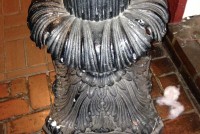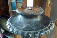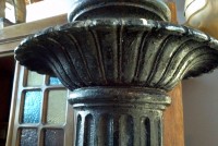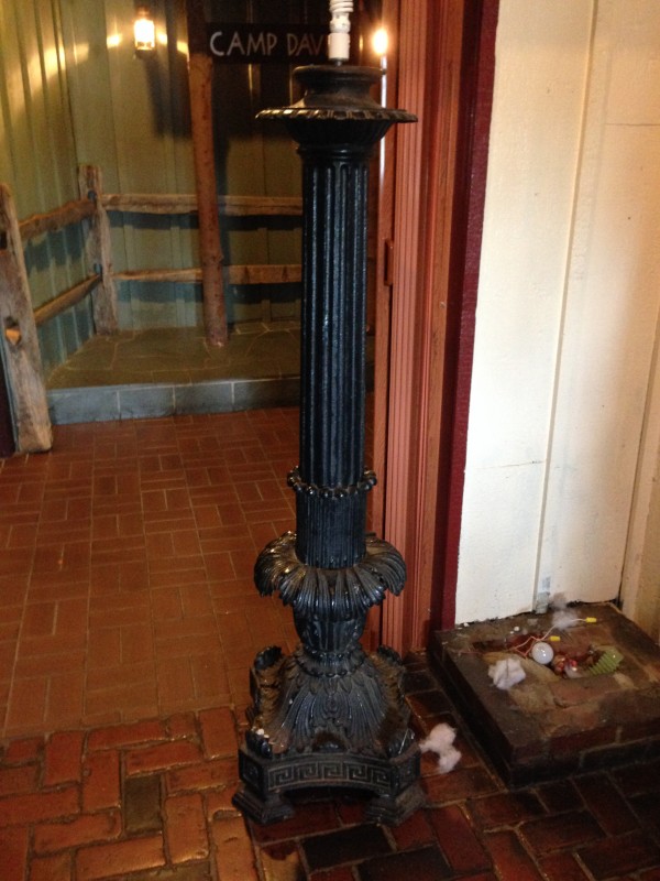 Pair of antique ornate cast iron lamp posts from Virginia. Measuring almost 5 1/2′ tall, these posts are all original and made of heavy forged cast steel. Will need globes but otherwise ready to grace any front or driveway entrance. Electrified………..
