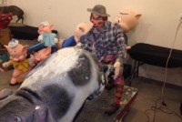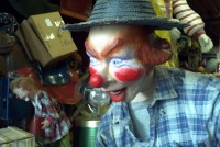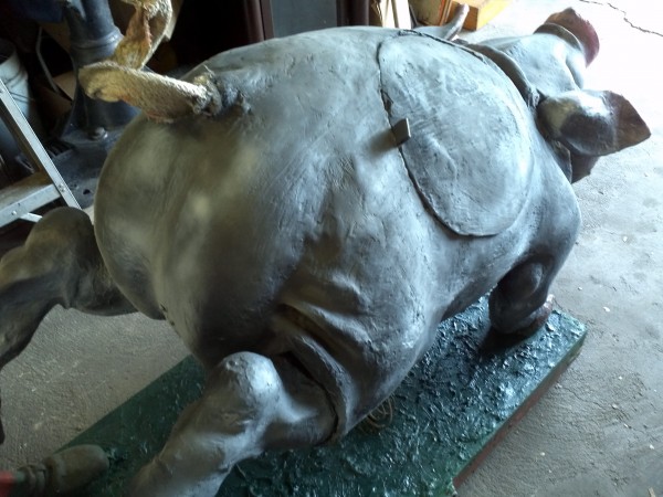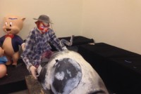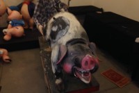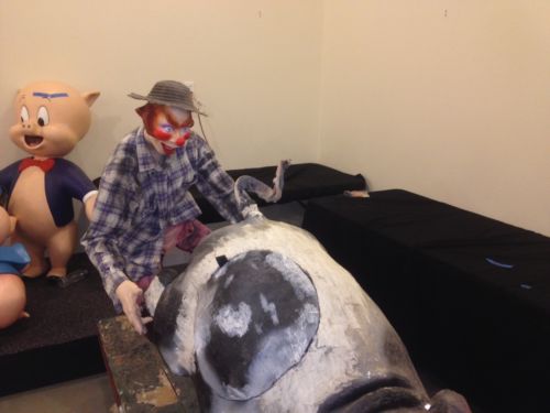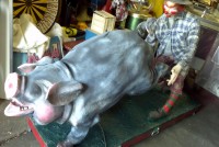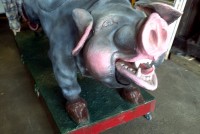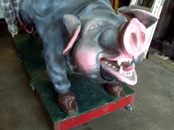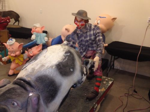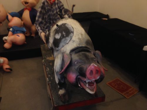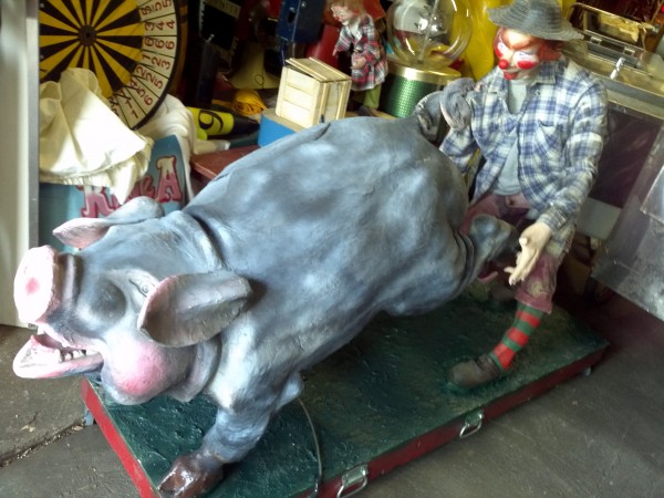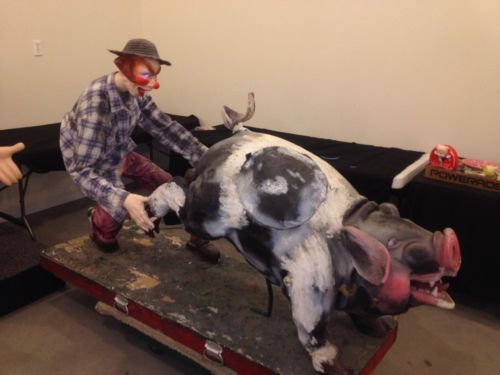 Old vintage amusement park funhouse animated clown chasing pig automaton in working condition. Measures over 7′ long with motor and cams located inside cavity of pig. Made mostly of paper mache. Neat old piece……..