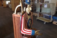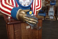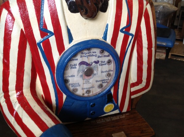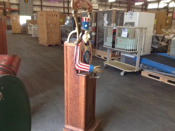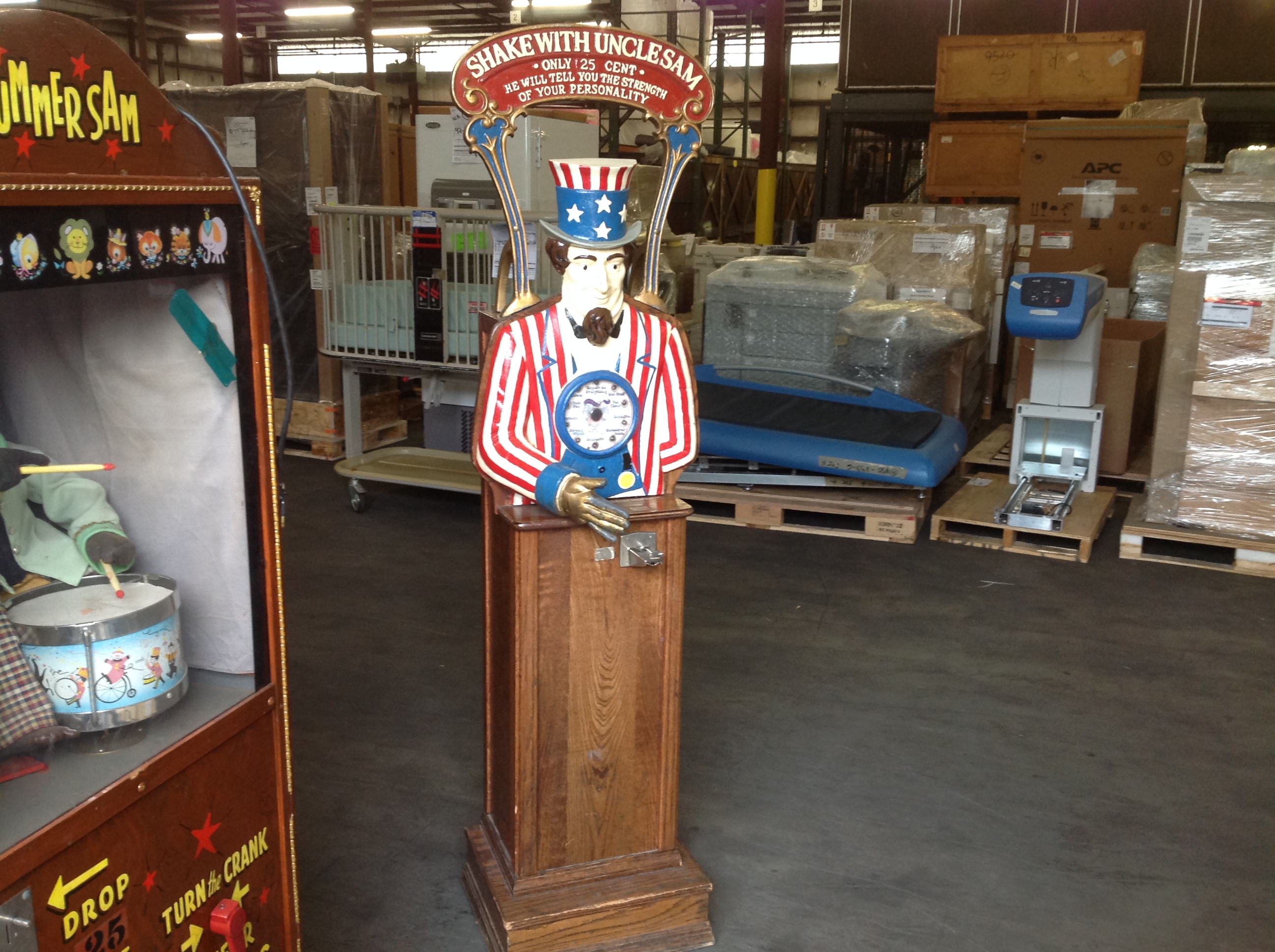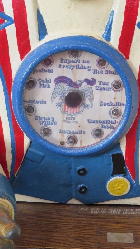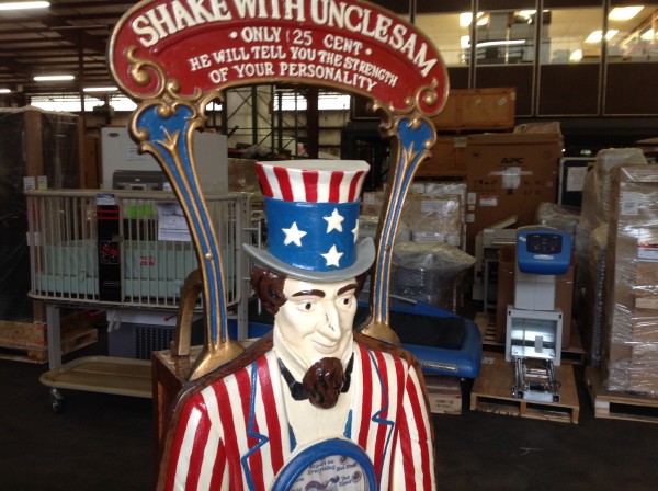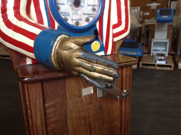 Amusement park penny arcade Uncle Sam grip test machine in as found working condition. Early reproduction but very well made. Deposit coin, grip Uncle Sam’s hand and record strength……………
