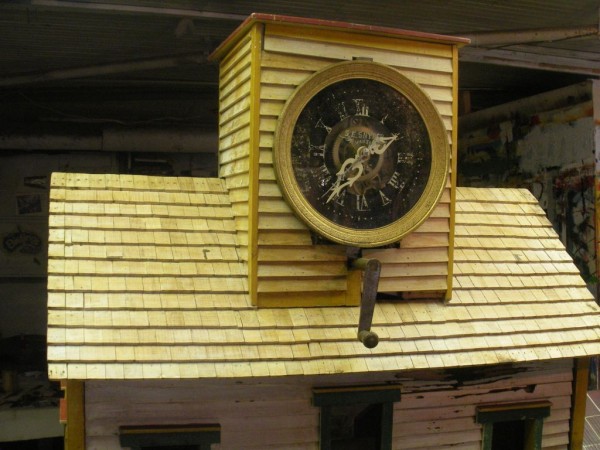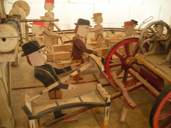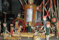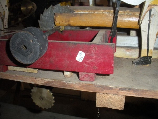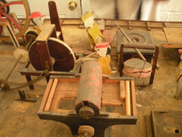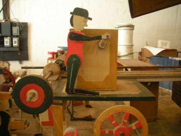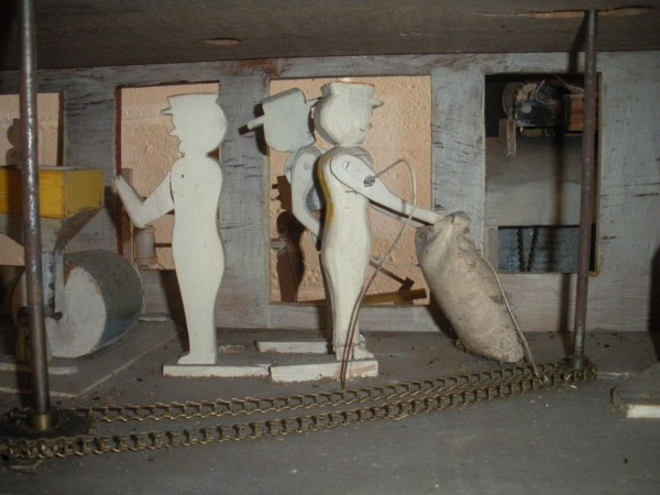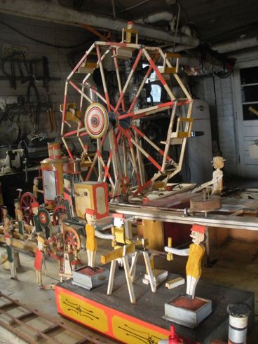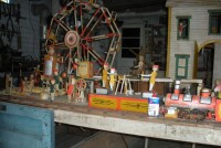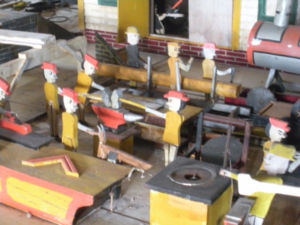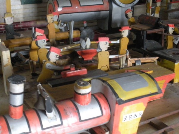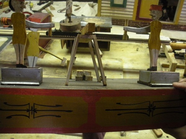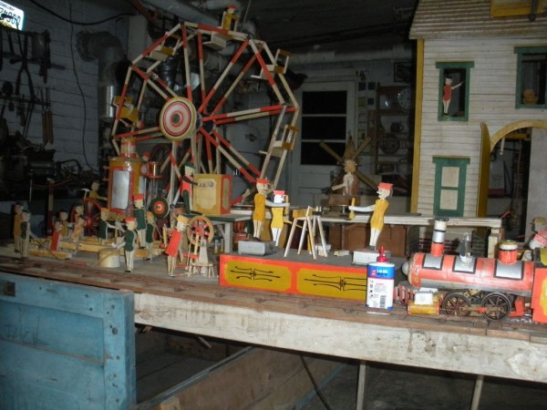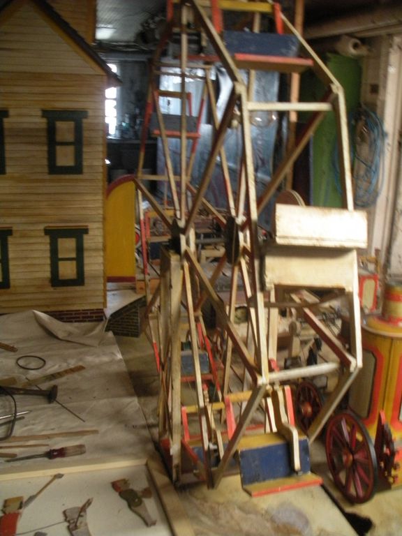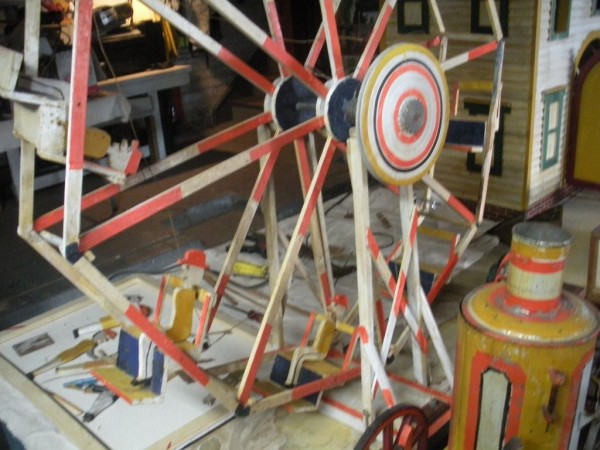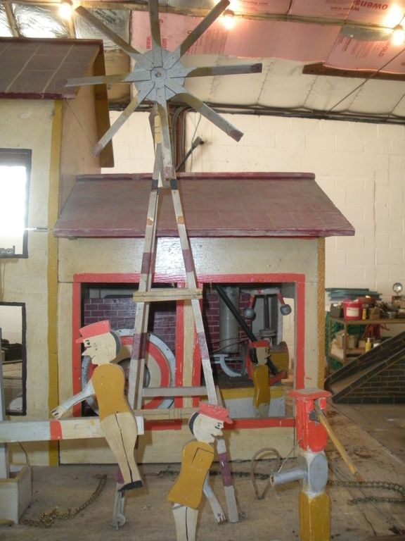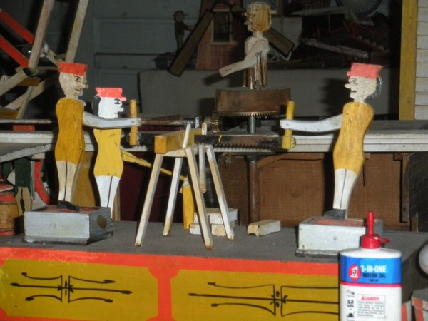 S E Snyder. Diorama fits into 5 crates with one crate protecting the 3′ ornate ferris wheel, two smaller crates hold a clock and very large springs and other mechanical parts used to operate this magnificent automaton. Two main and largest of the blue painted crates houses four 3′ x 6′ platform tables. Connected to the tables are dozens of handmade, whirligig-style men engaged in various 19th century activities such as sawing logs into planks, working an iron forge, men working in a grist mill and a working windmill with a real water pond that activates a fisherman. These are a few of the movements that will amaze the new buyer. All the machinery and men pictured on the tables are in motion when the clock’s main spring is fully wound. There is a separate electric motor powered train that runs across the front of the display painted with the letters S.B.& B. Underneath the tables are a complex grouping of cogwheels, pulleys and hand carved wooden escapements, brass rods with gear end and small gauge chains that put everything into motion. The large central building holds the clock and it’s mechanisms to power everything.