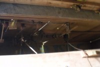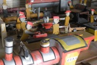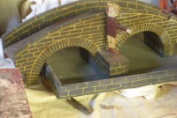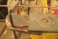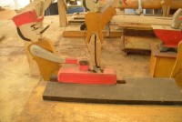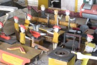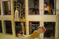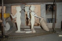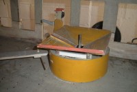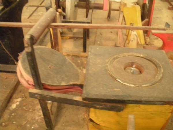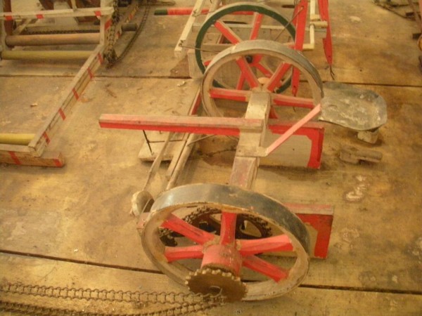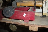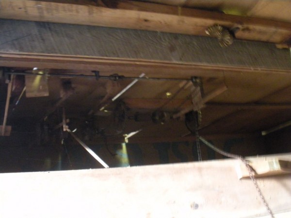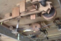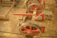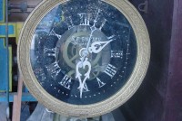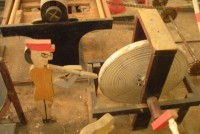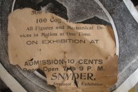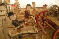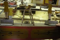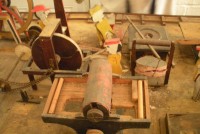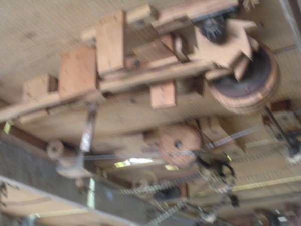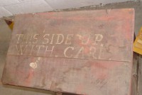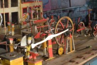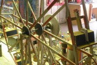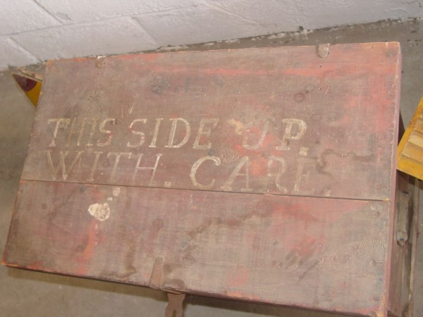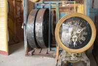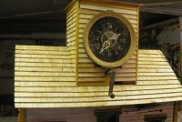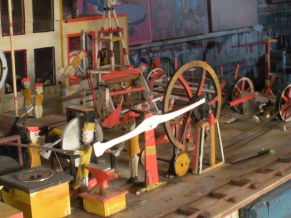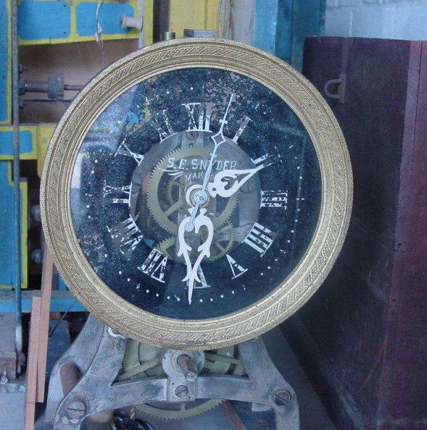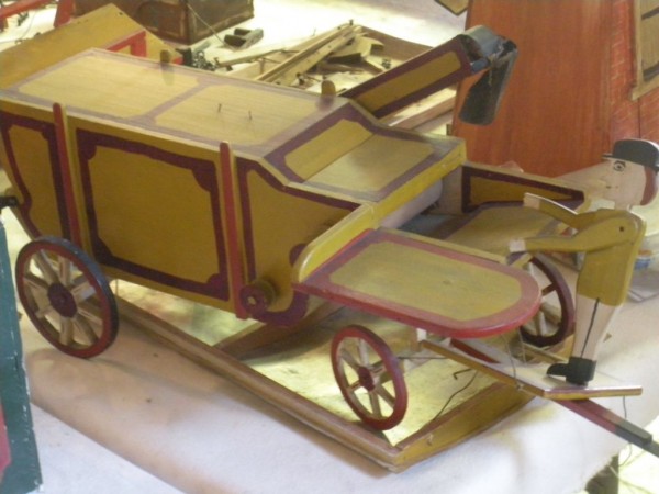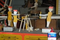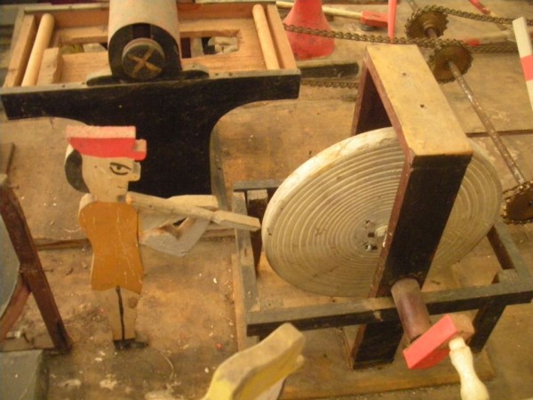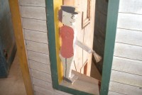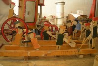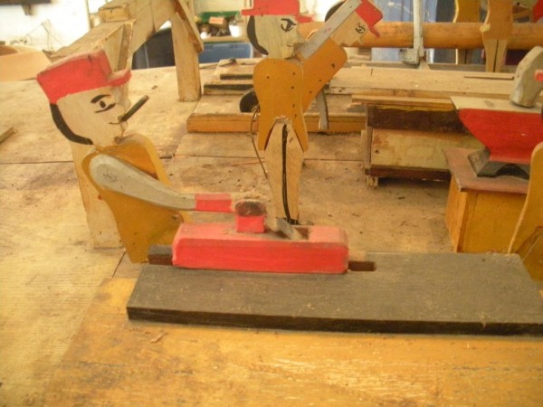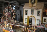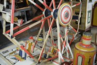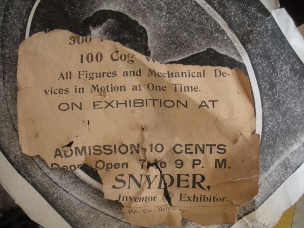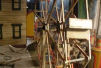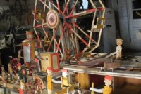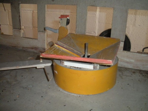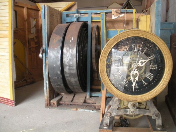 S E Snyder. Diorama fits into 5 crates with one crate protecting the 3′ ornate ferris wheel, two smaller crates hold a clock and very large springs and other mechanical parts used to operate this magnificent automaton. Two main and largest of the blue painted crates houses four 3′ x 6′ platform tables. Connected to the tables are dozens of handmade, whirligig-style men engaged in various 19th century activities such as sawing logs into planks, working an iron forge, men working in a grist mill and a working windmill with a real water pond that activates a fisherman. These are a few of the movements that will amaze the new buyer. All the machinery and men pictured on the tables are in motion when the clock’s main spring is fully wound. There is a separate electric motor powered train that runs across the front of the display painted with the letters S.B.& B. Underneath the tables are a complex grouping of cogwheels, pulleys and hand carved wooden escapements, brass rods with gear end and small gauge chains that put everything into motion. The large central building holds the clock and it’s mechanisms to power everything.