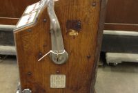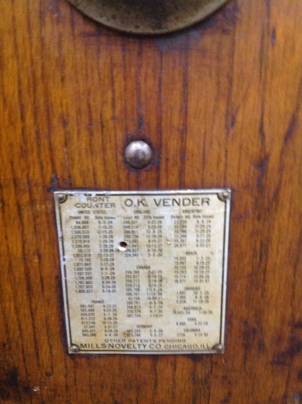 Antique 1930″ five cent Mills F.O.K. slot machine in as found condition. Complete with mint vendor option. Vends mints from right side only as left vendor mechanism is long gone. Working condition. Vending mints was a way to get around the gambling laws of years past. Nice patina……….