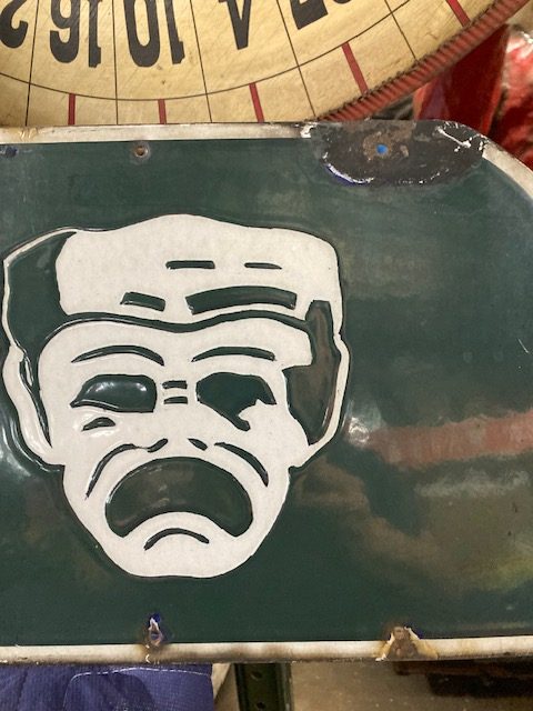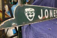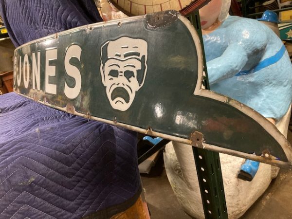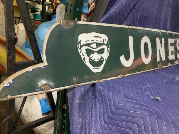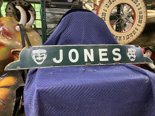 Wonderful old antique porcelain over steel sign from A.T. Jones Costume Gallery, Baltimore,MD. As found condition with bright lettering measuring 6’4″ long x 12″ high. A.T Jones is now closed but served the Baltimore region since 1868, over 150 years ago. Known as the oldest costume shop in America. Own a piece of true Americana…………….