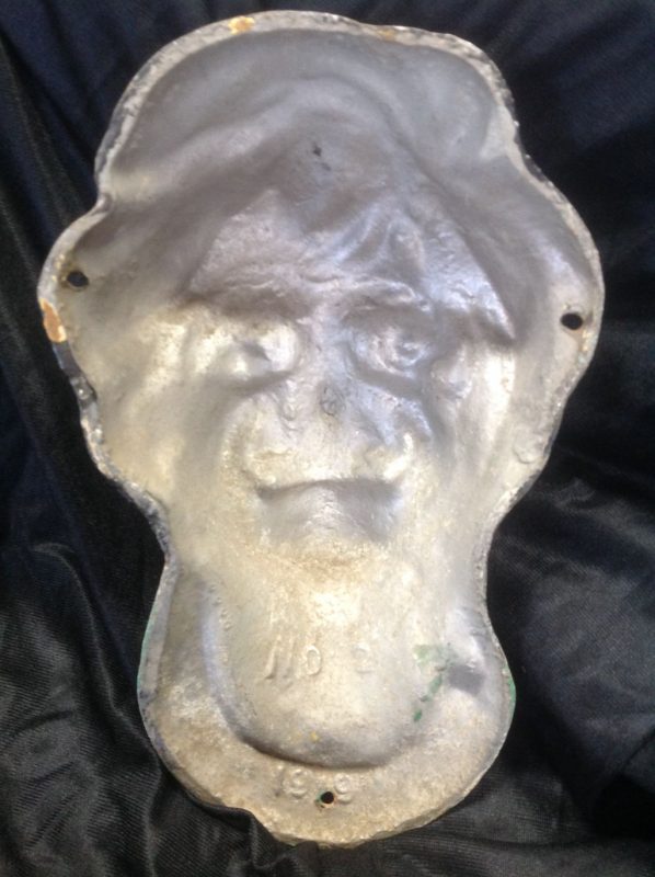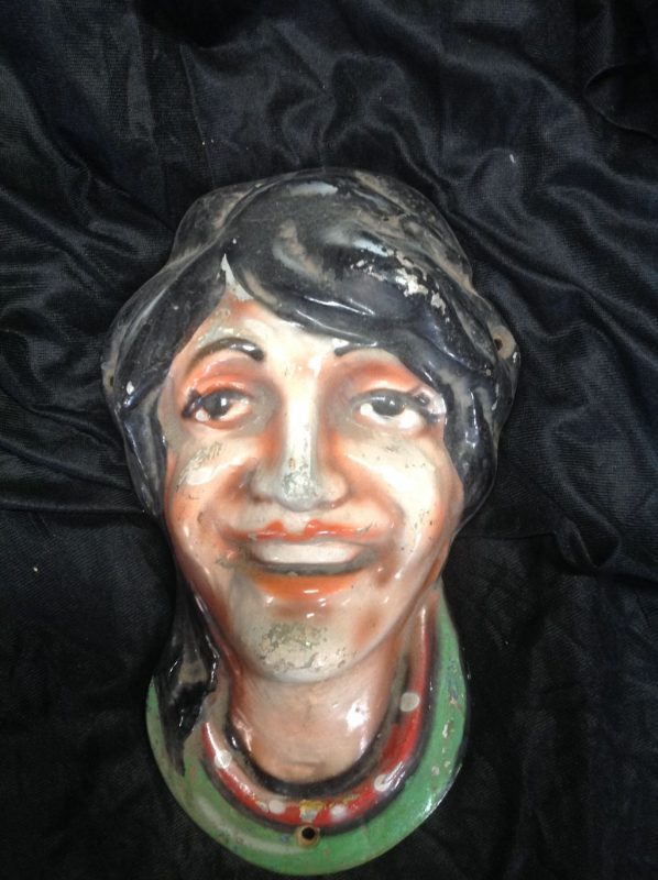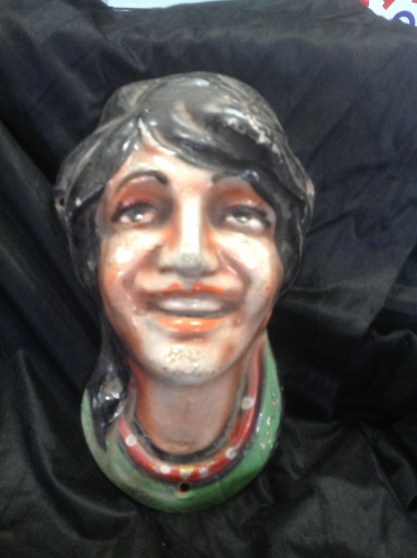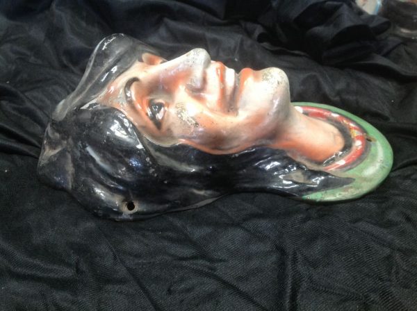 Antique cast metal Allan Herschell carousel rounding board lady head in as found condition. Measures about 11″ x 6″ with nice park paint………..