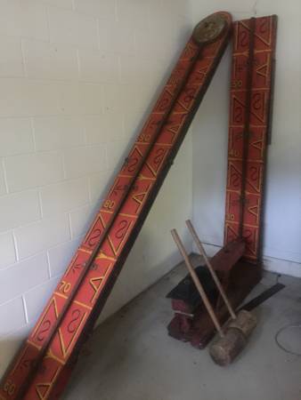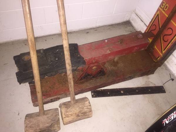 Antique amusement park carnival strongman high striker in as found condition. Vintage is the word, as this striker has wonderful old park paint as well as a very primative mallet. Measures over 15′ tall. Neat old carnival game with plenty of patina……….