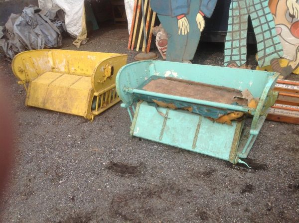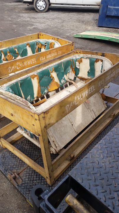 12 antique carnival amusement park wood 1940’s Eli ferris wheel seats in as found condition. All seats will need cleaning and some restoration. Metal seats are always available but wood seats are getting harder to find………
