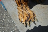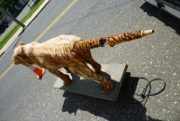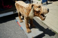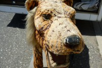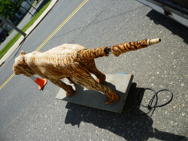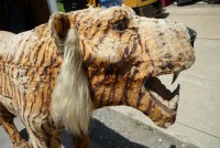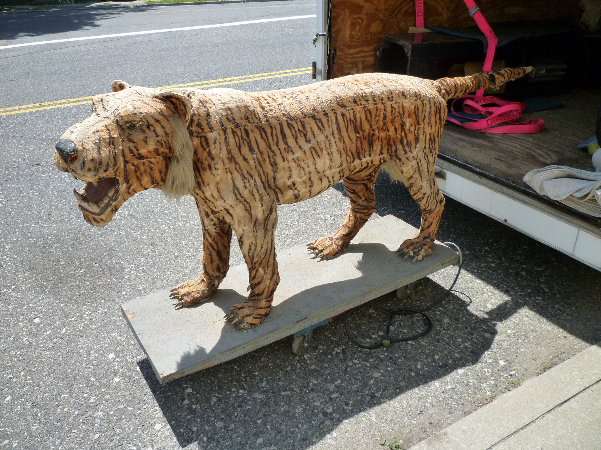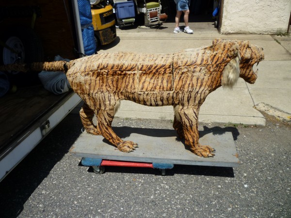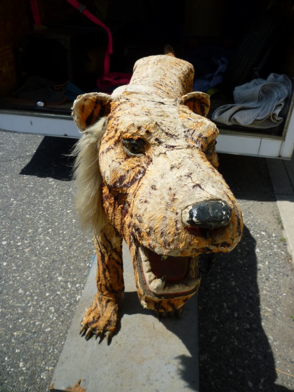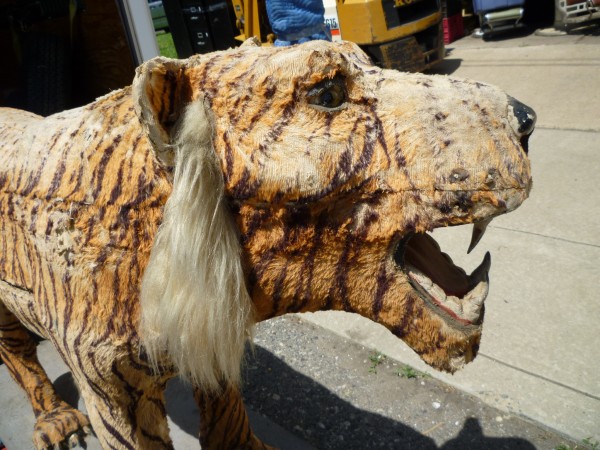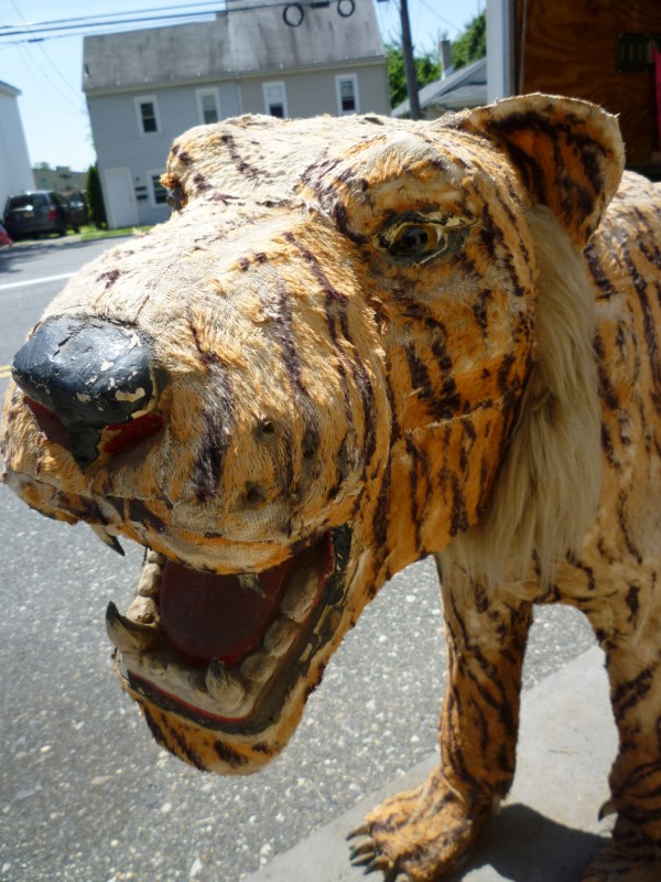 Wonderful old 1940’s amusement park animated tiger in working condition. Head and tail move. As found condition. Fabric overlay shows signs of age with tears but adds to the charm of this very rare example. Face, ears and feet are paper mache with glass eyes. Hard to find……