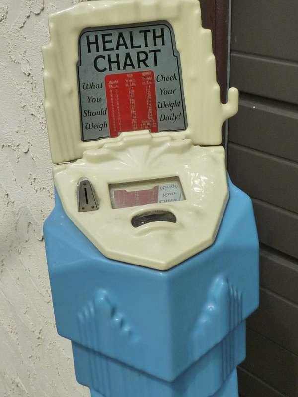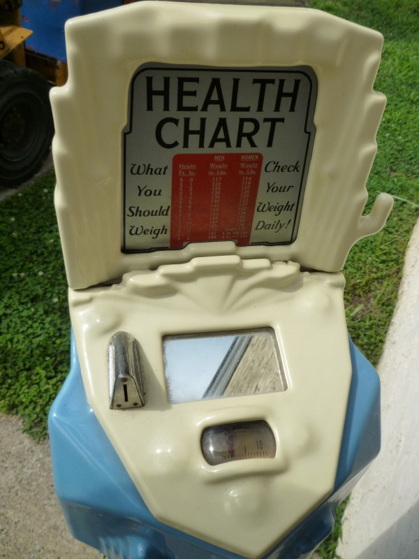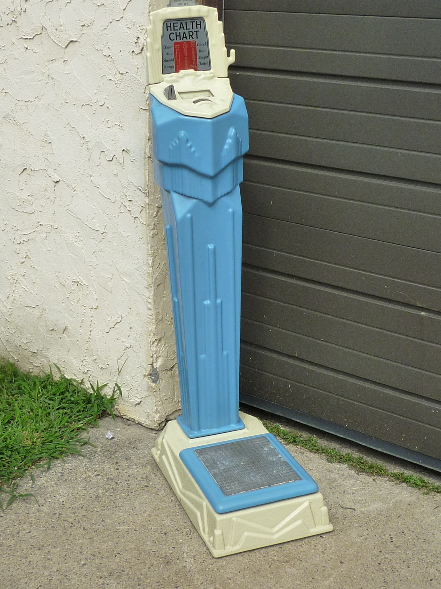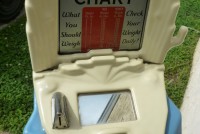 Art deco drug store coin operated scale in working condition. Rare blue color with virtually no porcelain chips. No keys. Would look good in any powder room or bathroom setting……