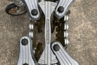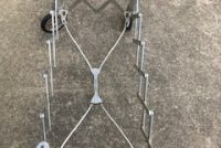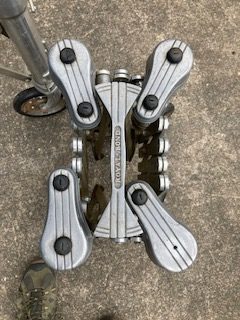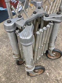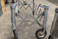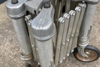 Pair of antique art deco funeral parlor folding trolley casket stands in as found condition. Both fold out and can support a full size casket for moving. Heavy cast metal construction………..
