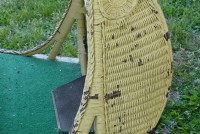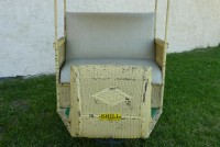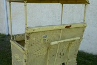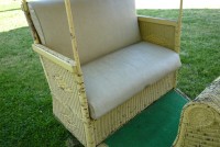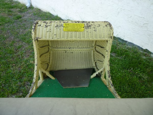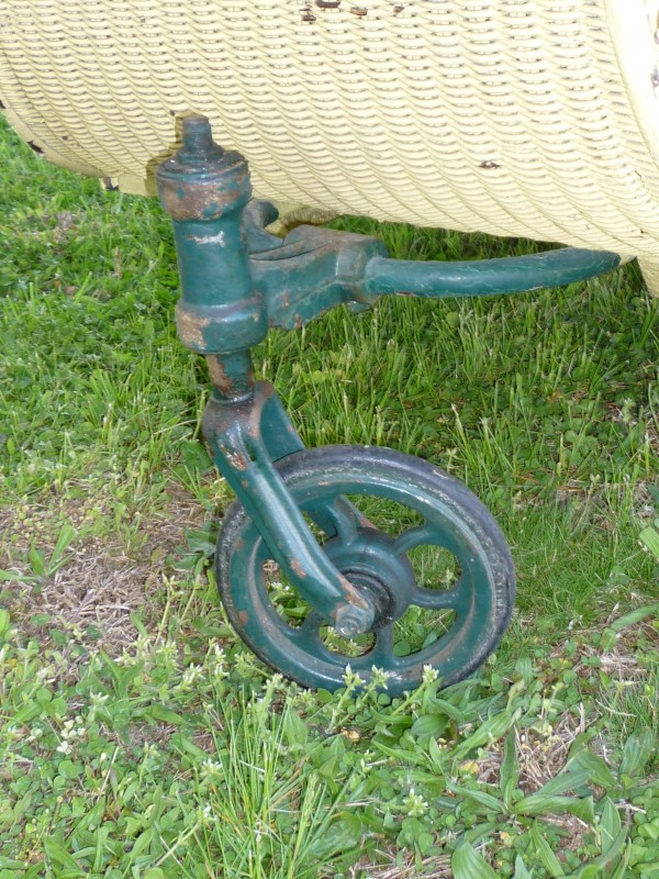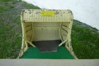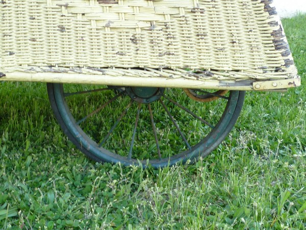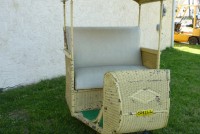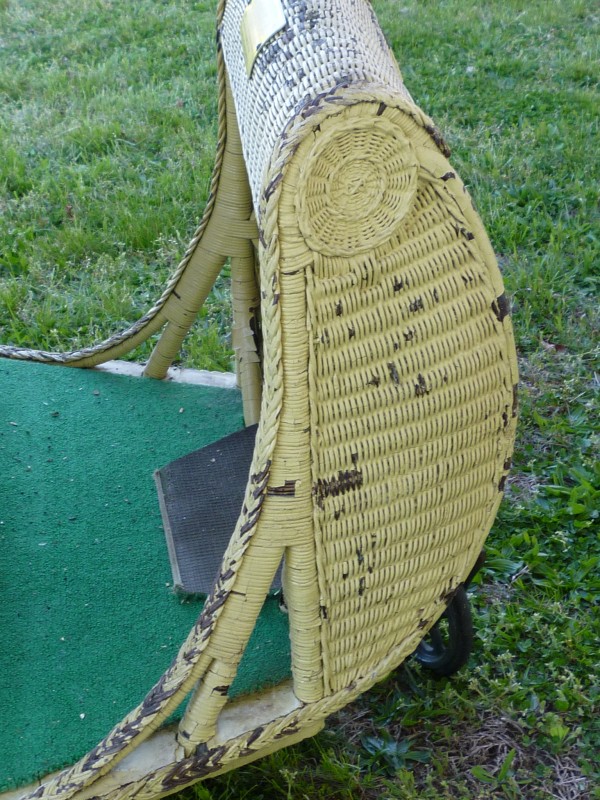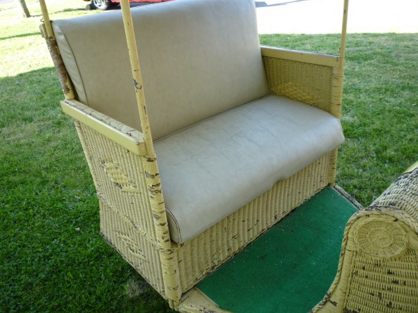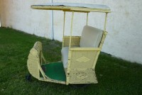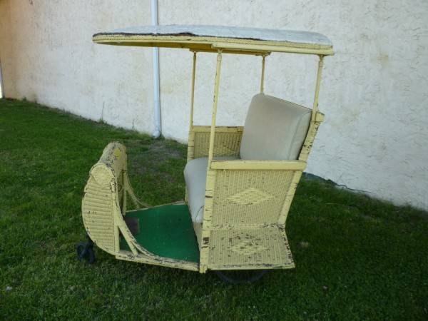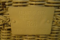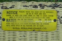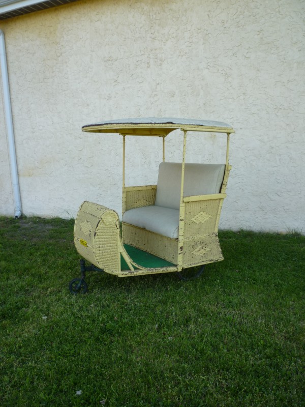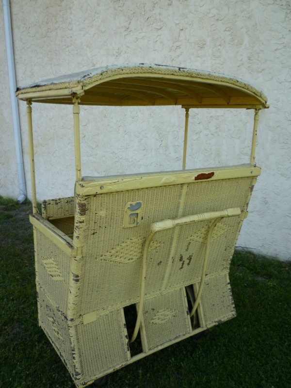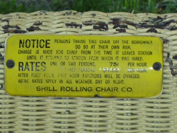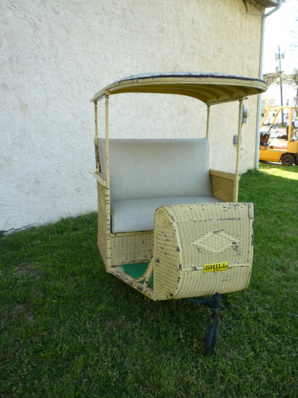 Wonderful example of an early antique Atlantic City Boardwalk Rolling Chair. Wicker in good condition with minor paint loss. Canopy has some minor canvas losses but otherwise in very nice shape. Good for displaying. Has original Shill porcelain sign with a tax tag dated 1962 as the last year used. Hard to find in this condition……….