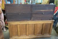Nice antique Baltimore general store display case and base in as found condition. Case is 6′ long x 2′ deep x 2′ tall. Base is 6′ long x 33″ tall x 26″ wide. Needs a piece of mirror on door back otherwise in nice condition for it’s age.