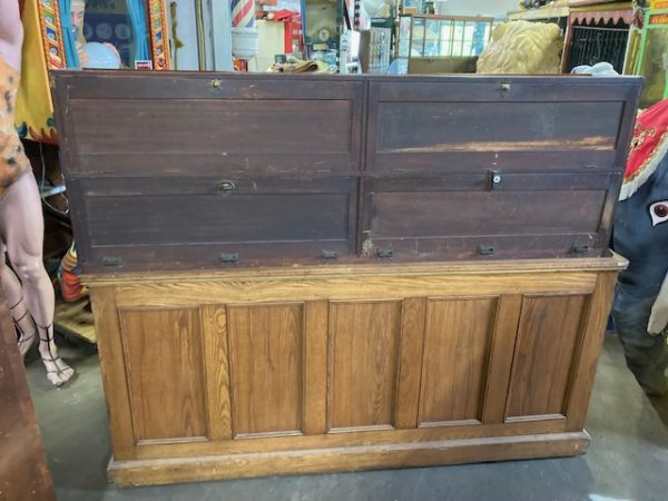 Nice antique Baltimore general store display case and base in as found condition. Case is 6′ long x 2′ deep x 2′ tall. Base is 6′ long x 33″ tall x 26″ wide. Needs a piece of mirror on door back otherwise in nice condition for it’s age.