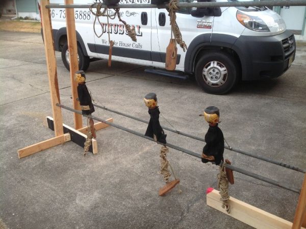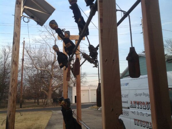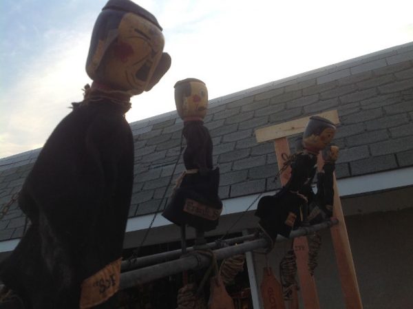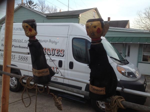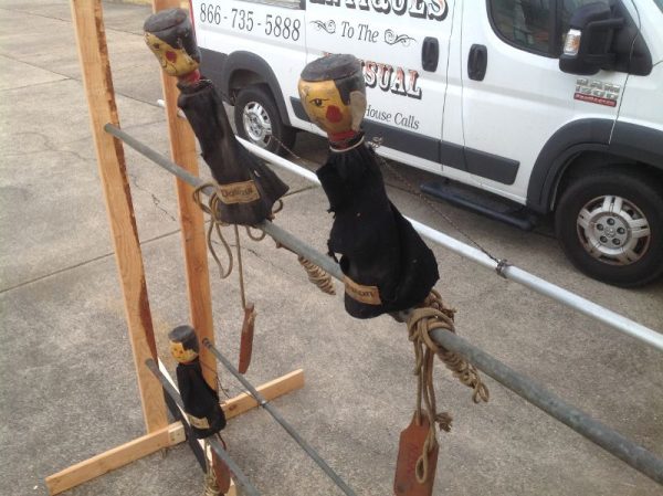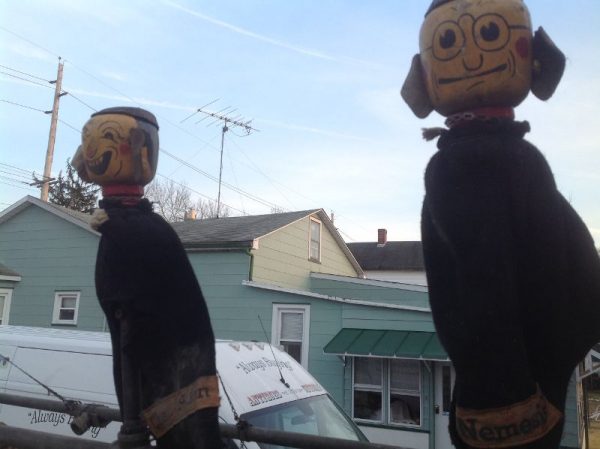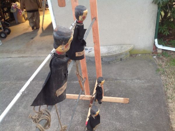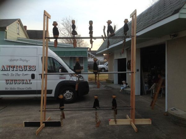 Antique, handmade carnival knockdown game in as found condition. Figures are made of wood, fabric and leather. Not sure how game plays or if all parts are there but the most important figures are present. Expect this game to be a ball or beanbag game. Found in a dirty, dusty Northeat Philadelphia church attic. You will not find another. Look at pictures to see figure details. Early carnival art. Real Americana………..